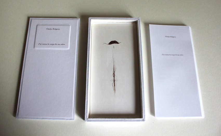 textes imprimés à l’encre pigmentaire sur Olin Bulk blanc 80g., accompagné d’une gravure imprimée en taille douce à la sanguine et ombre calcinée sur papier Magnani Incisioni blanc 300g, 40 pages, 9×19cm, coffret habillé de Olin Bulk blanc et Magnani Incisioni imprimé