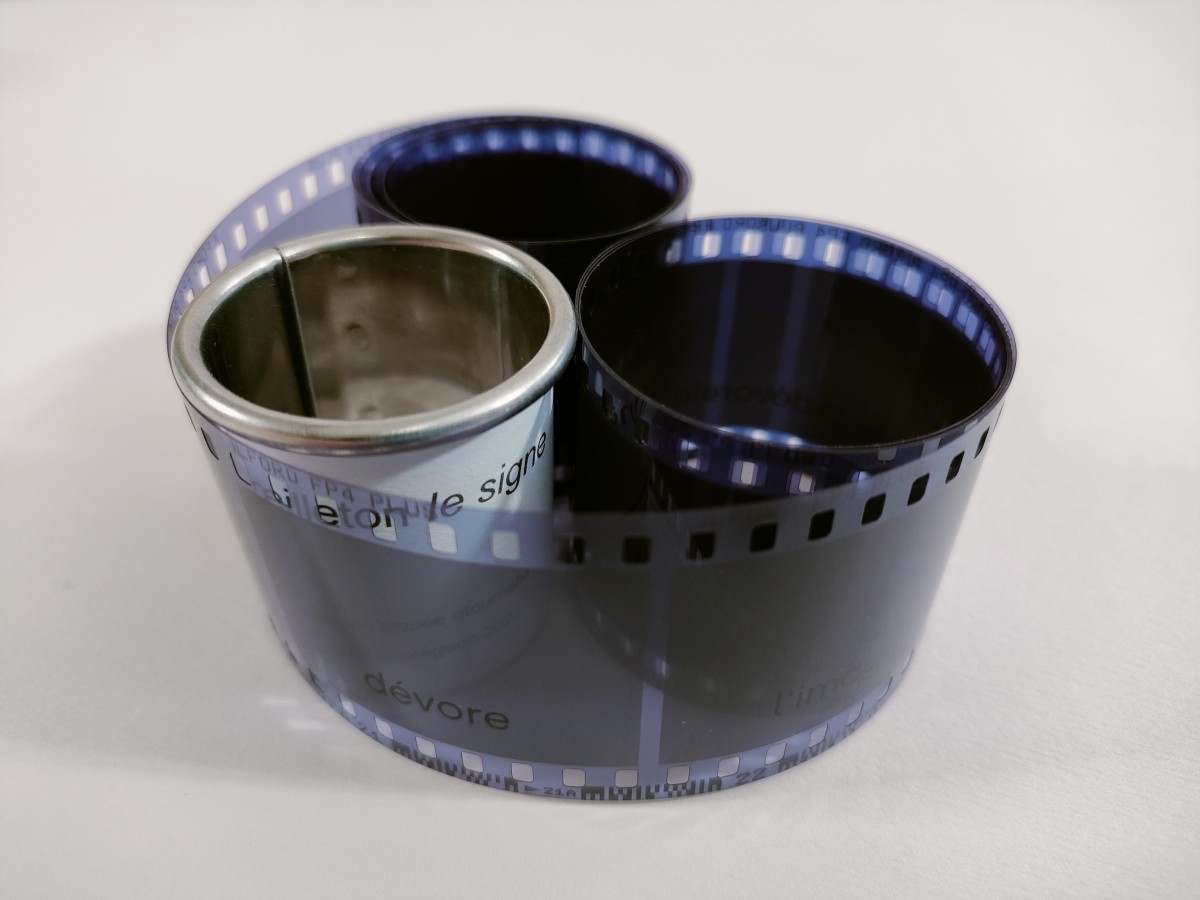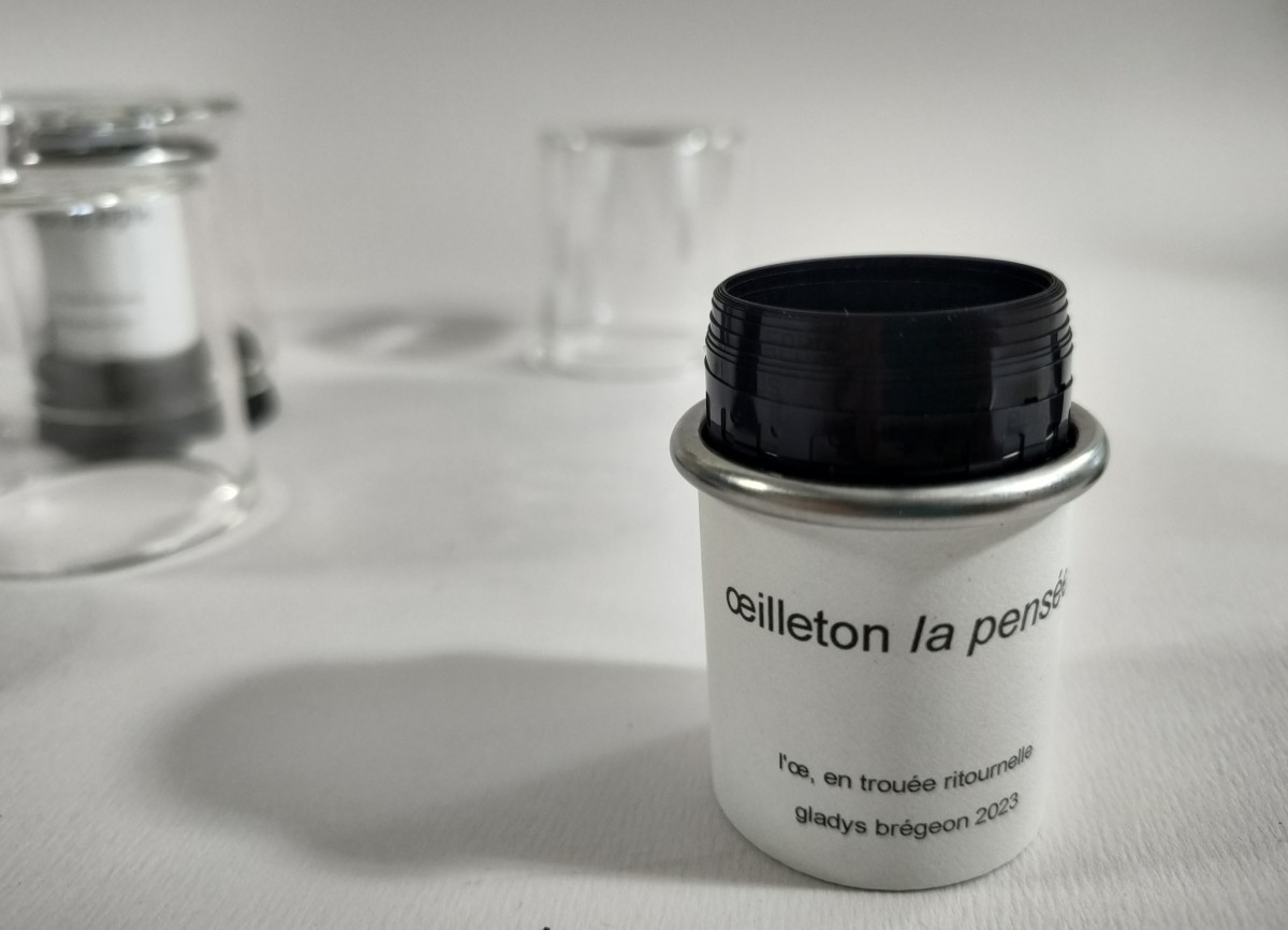 textes photographiés sur film négatif 35mm Ilford N&B environ 30 poses, tube inox de 3x3,8cm, flacon verre et liège.