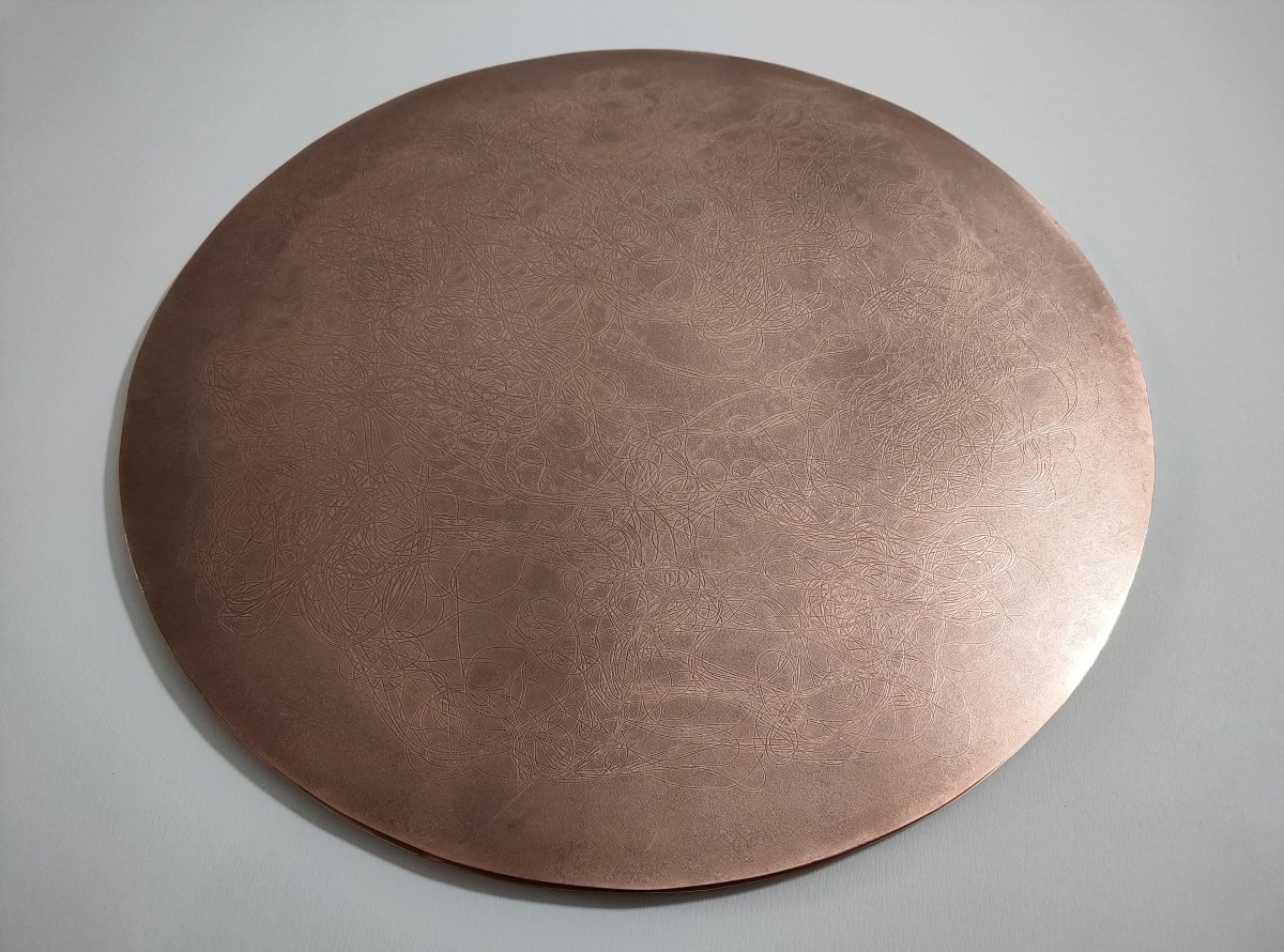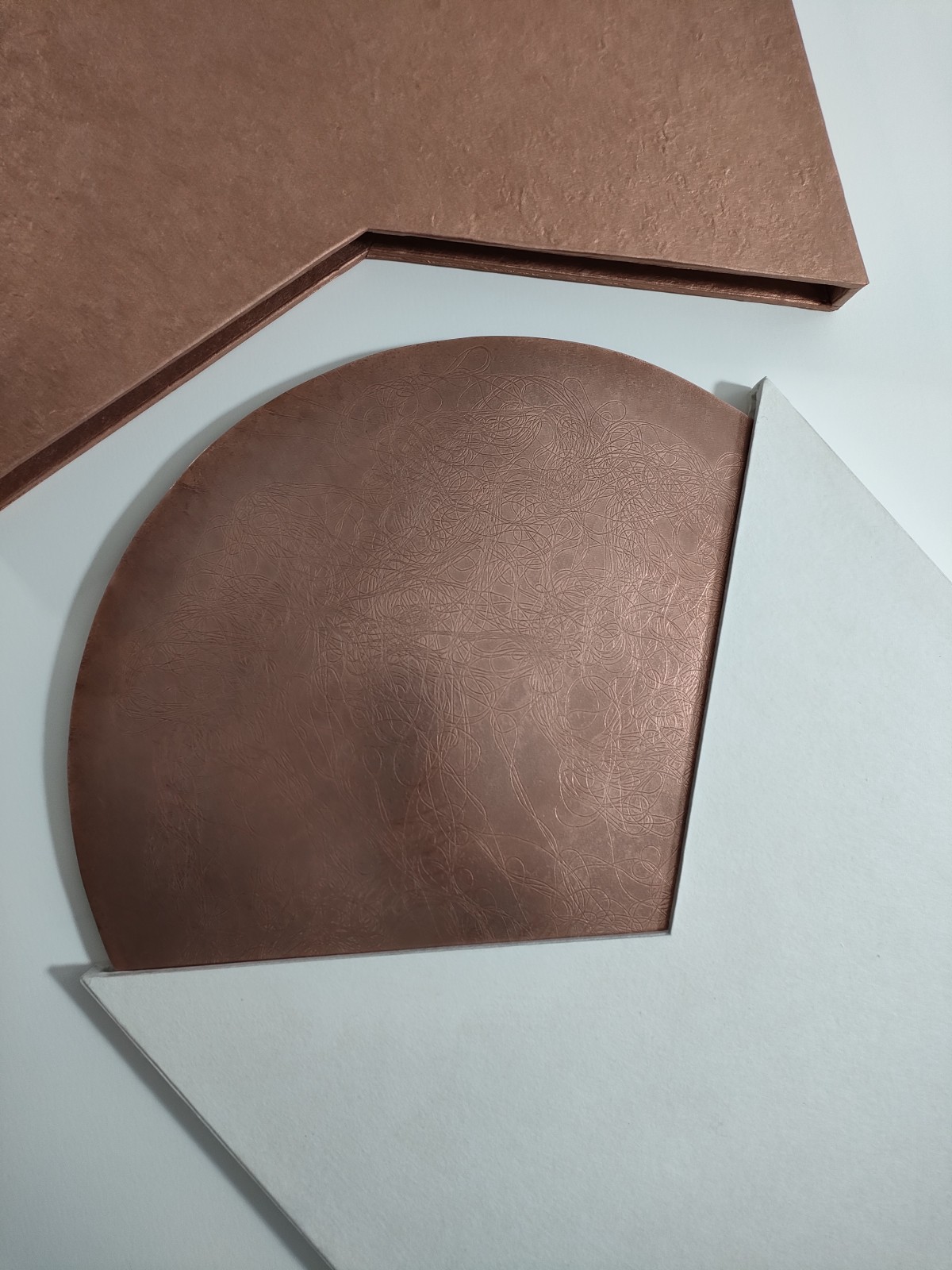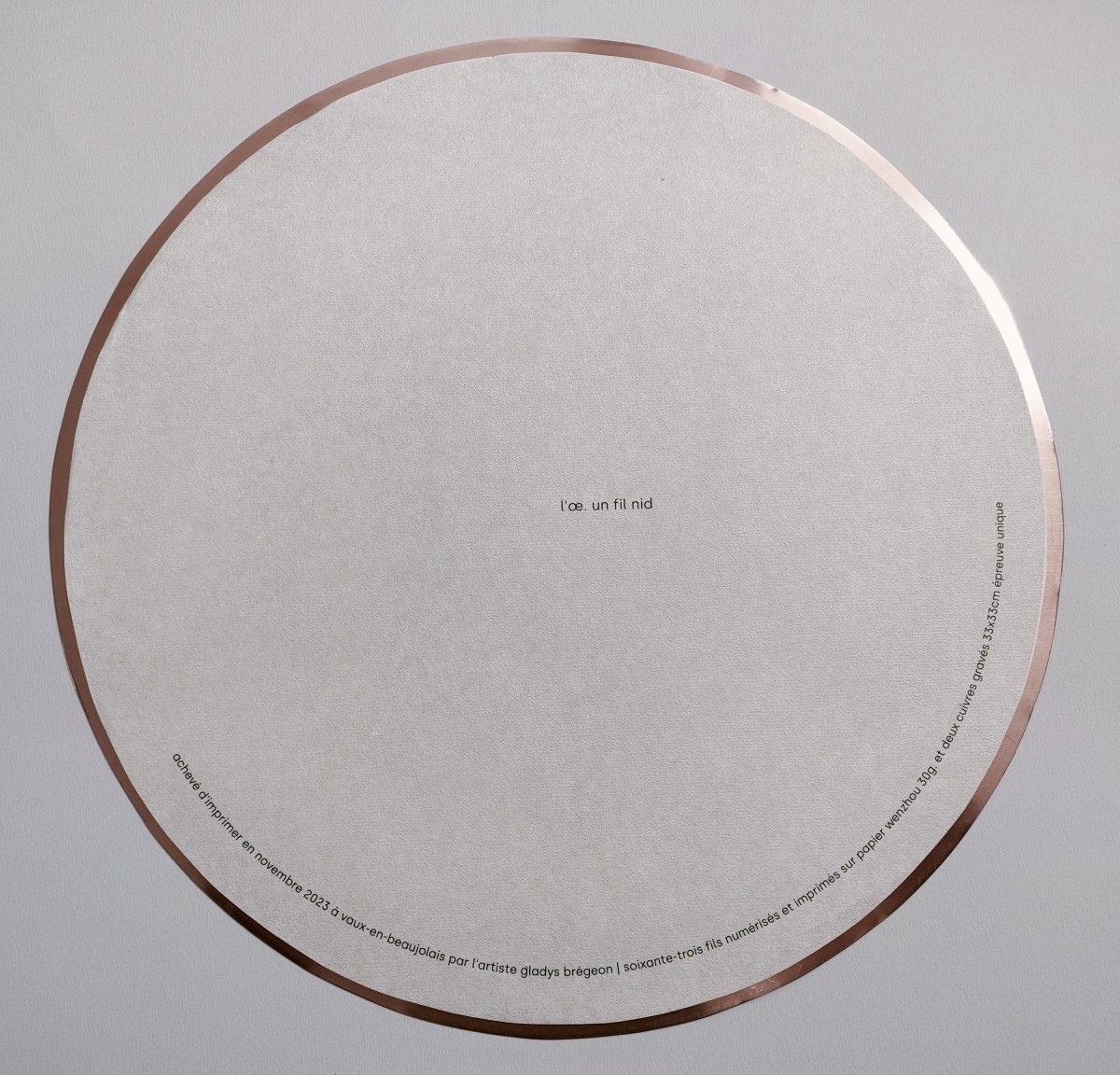 Livre-objet composé de soixante-et-une estampes estampes numériques imprimées à l'encre pigmentaire sur papier Wenzhou blanc 30g., 2 cuivres gravés de 33cm de diamètre, emboîtage habillage Kozo blanc naturel et Lokta cuivré, 39x39 cm