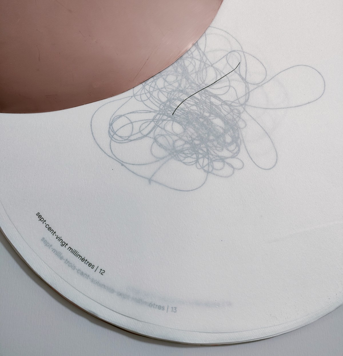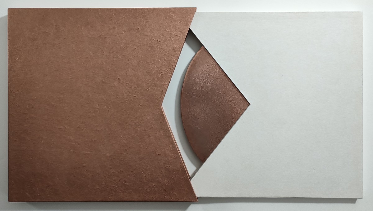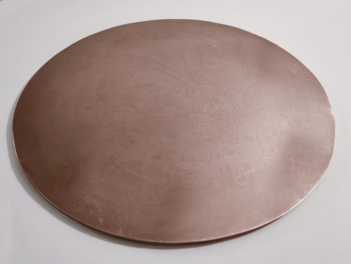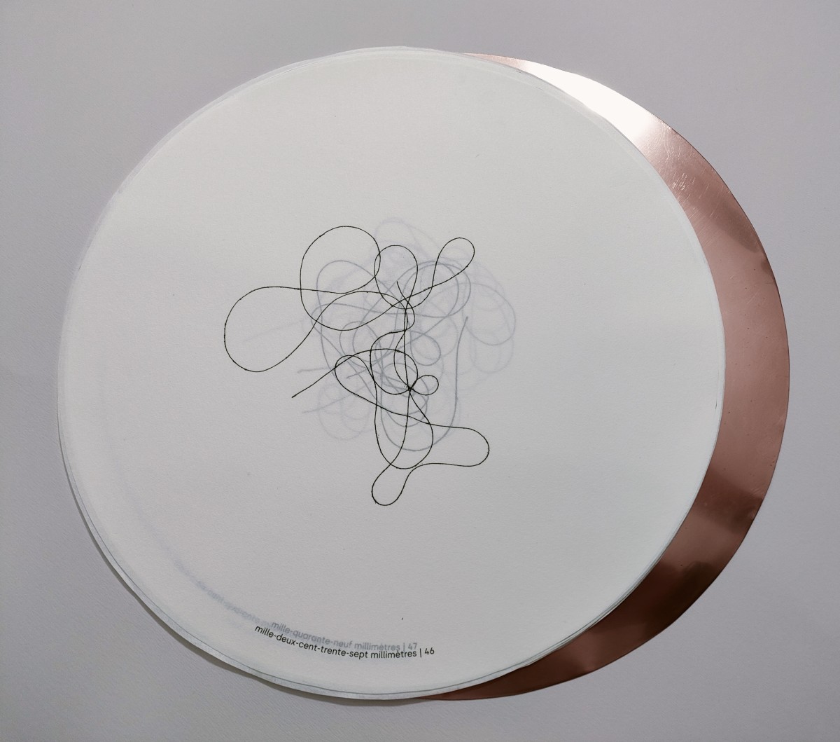 Livre-objet composé de soixante-et-une estampes estampes numériques imprimées à l'encre pigmentaire sur papier Wenzhou blanc 30g., 2 cuivres gravés de 33cm de diamètre, emboîtage habillage Kozo blanc naturel et Lokta cuivré, 39x39 cm