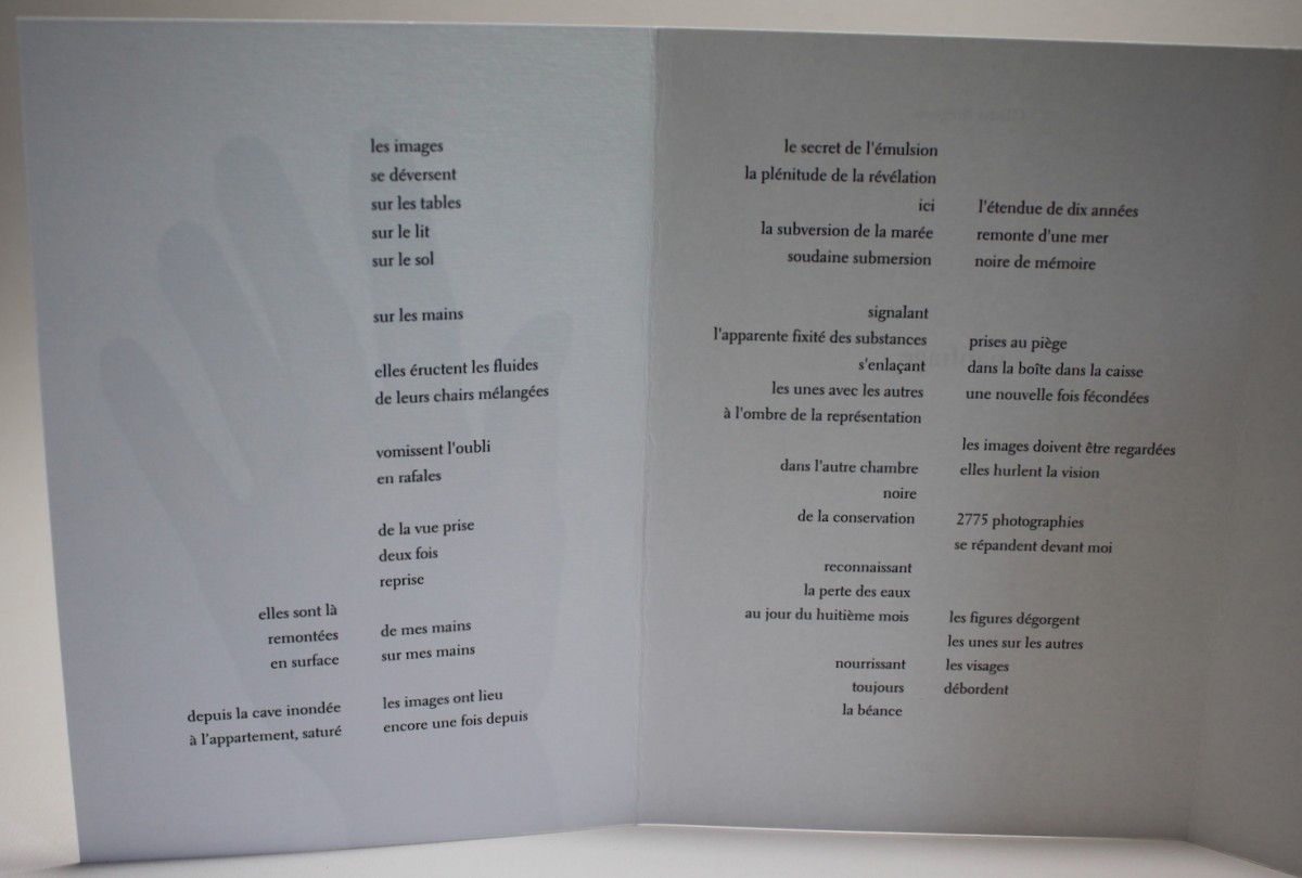 Ce que cela raconte de nos mémoires et des images : 2775 clichés (négatifs 24×36, 6×9, 13×18 et tirages papiers 9×13, 10×15, 13×18, 18×24) renaissent d'un dégât des eaux, s’en retournant à la chimie d’une mémoire des fluides.