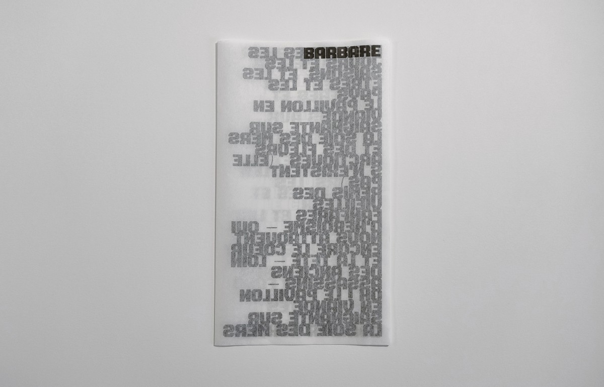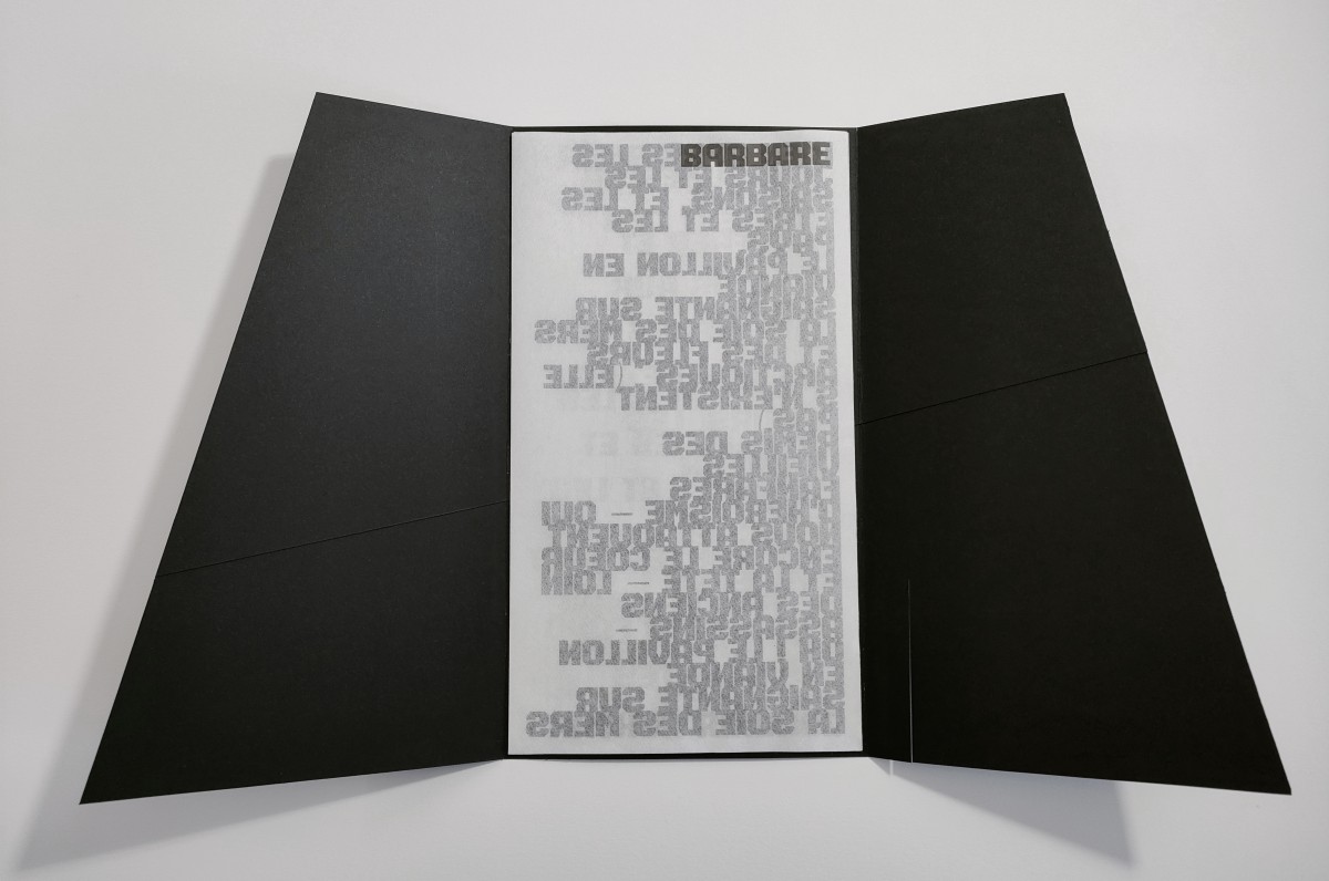 imprimé en police Barbara sur papier Wenzhou 30g. blanc 15x27cm, 2 plis, étui en pliage imbriqué Maya Clairefontaine 270g. noir 15,5x27,5cm