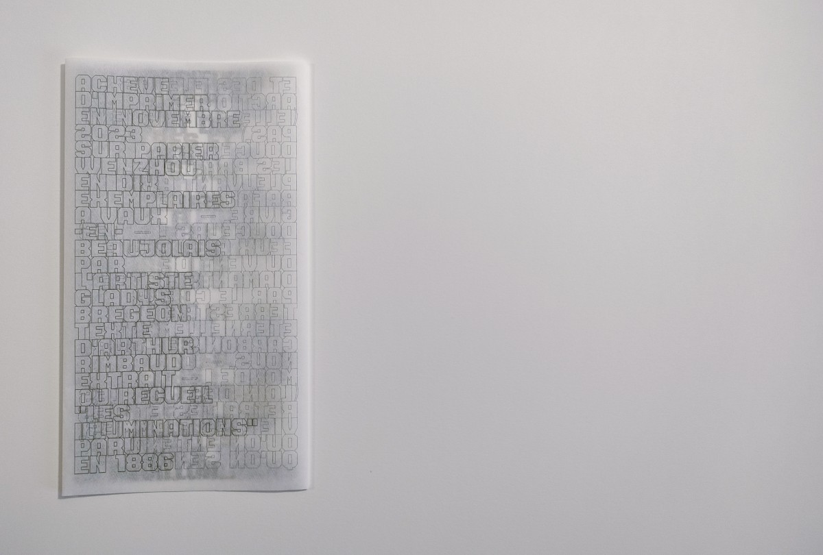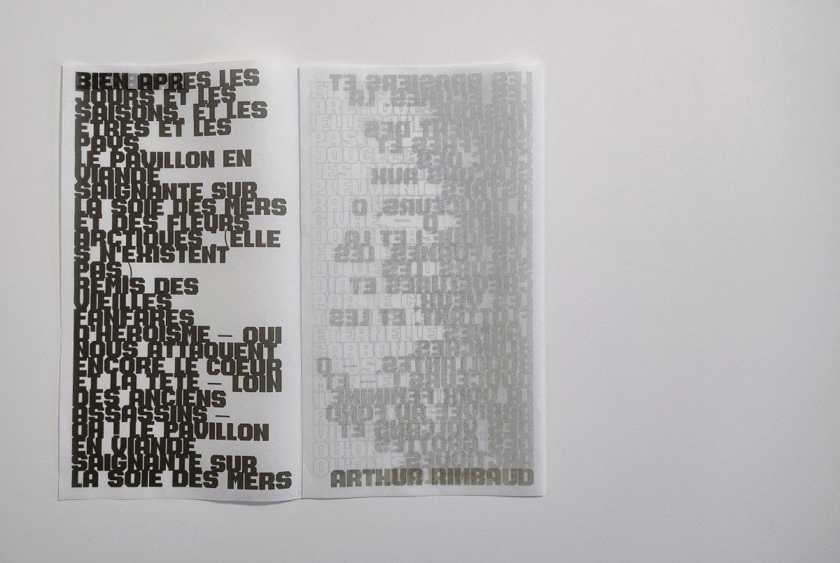 Les trois mystérieuses couleurs dont fait allusion Arthur Rimbaud dans ce poème veillent ici sous le noir du texte, frontalement donné à lire dans sa partition déstructurée.