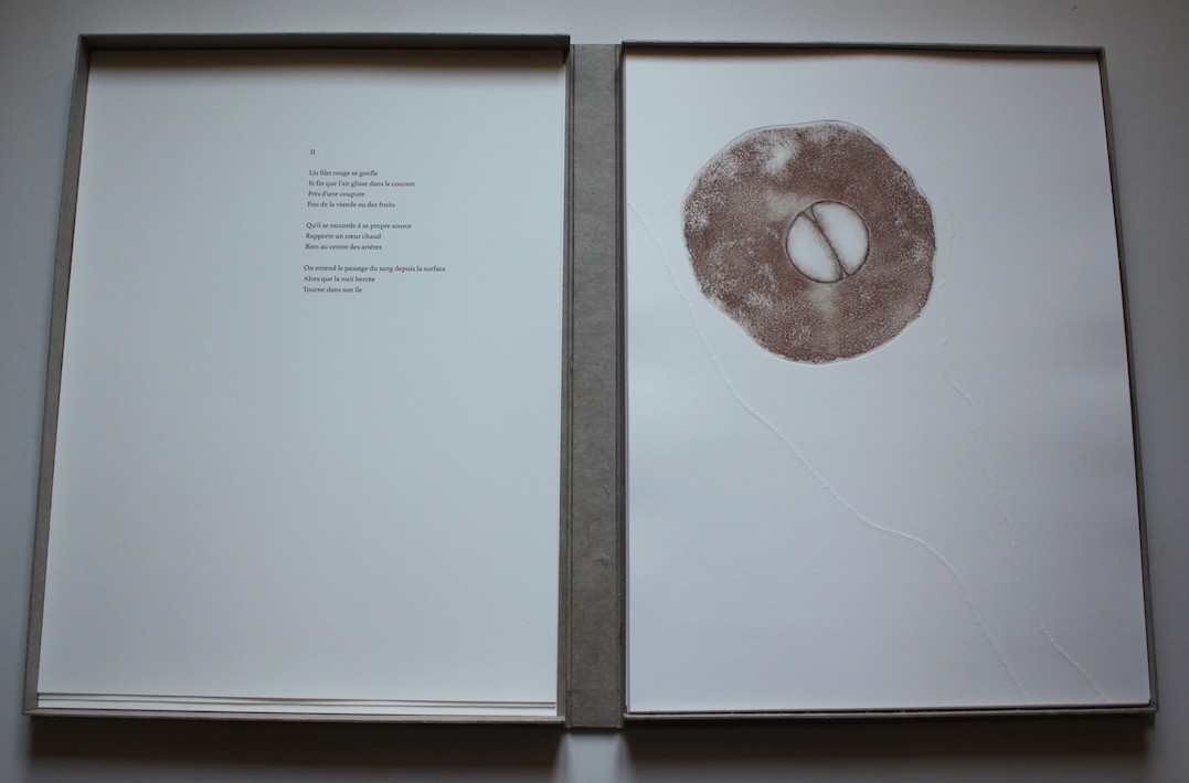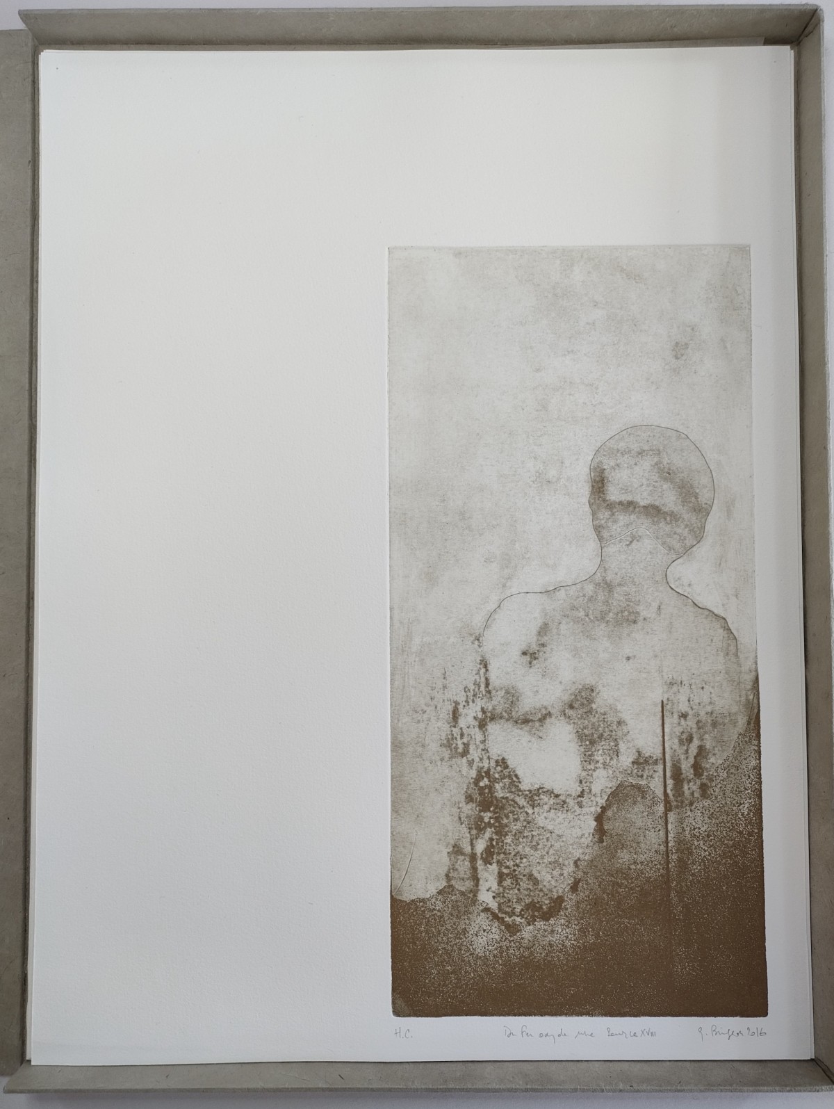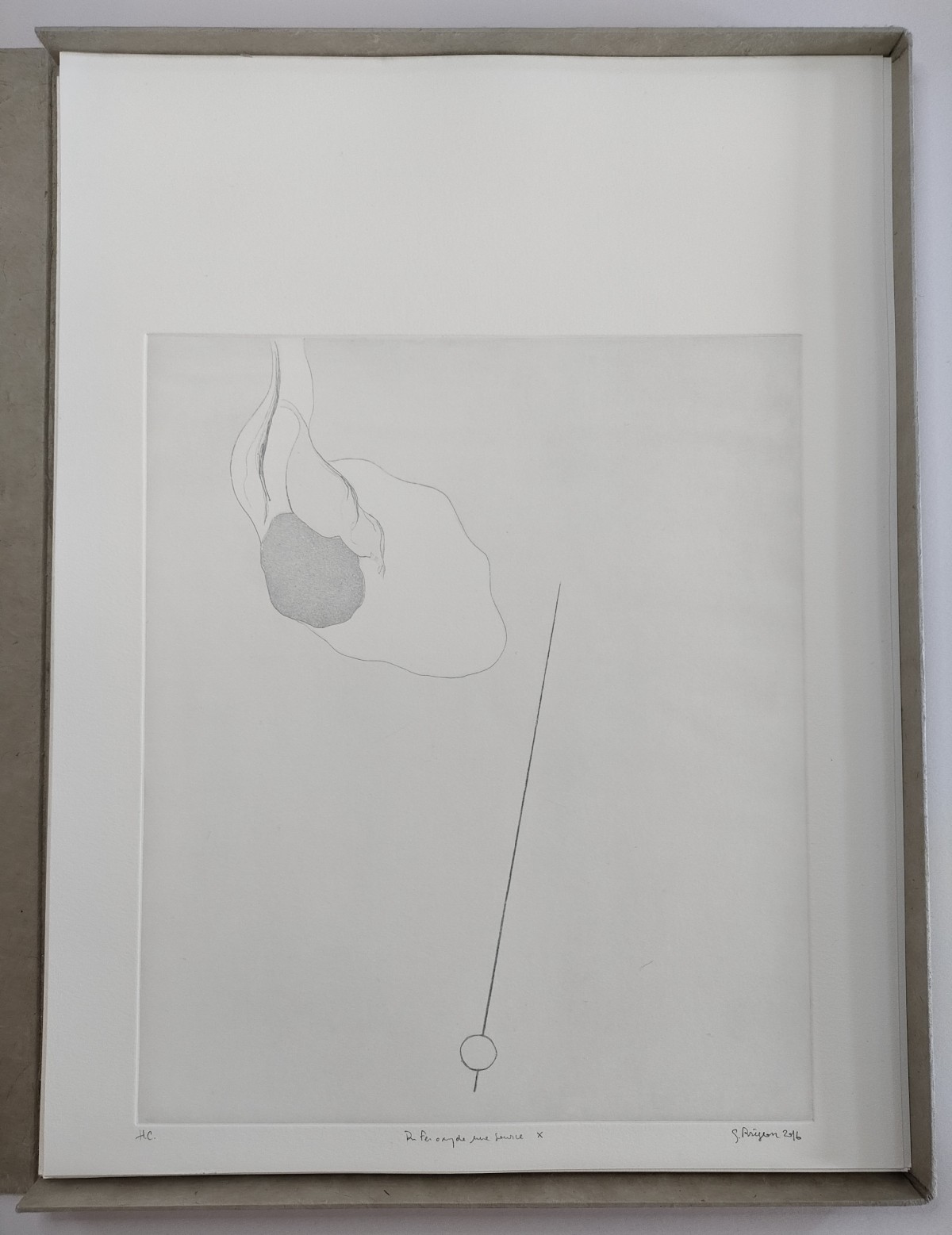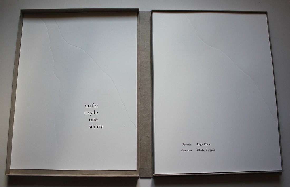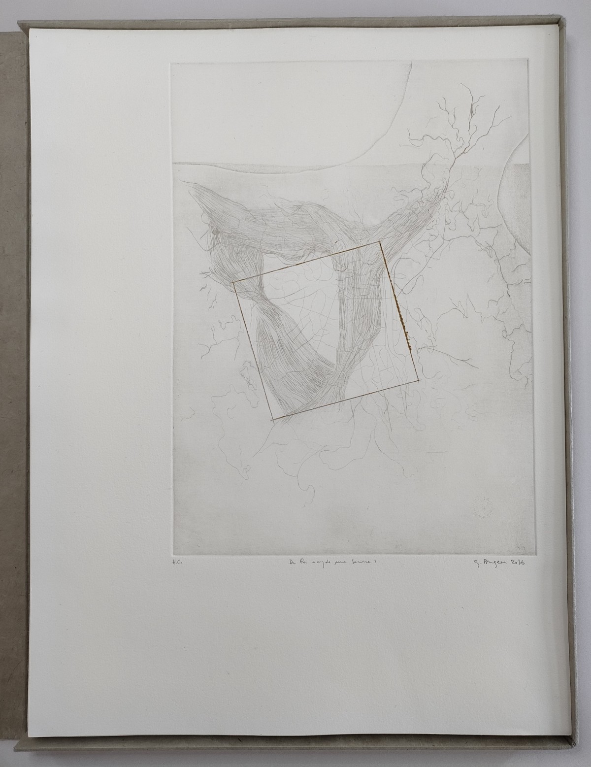 vingt textes imprimés à l’encre pigmentaire sur BFK Rives blanc 250g. accompagnés de vingt gravures imprimées sur papier BFK Rives blanc 250g, 43 planches, 38x50cm, emboitage habillé de Lokta gris réalisé par Carole Meigne, atelier de reliure In Quarto (01)