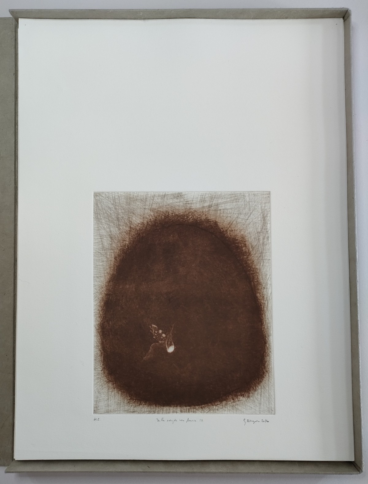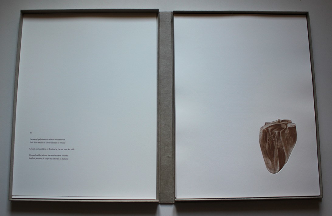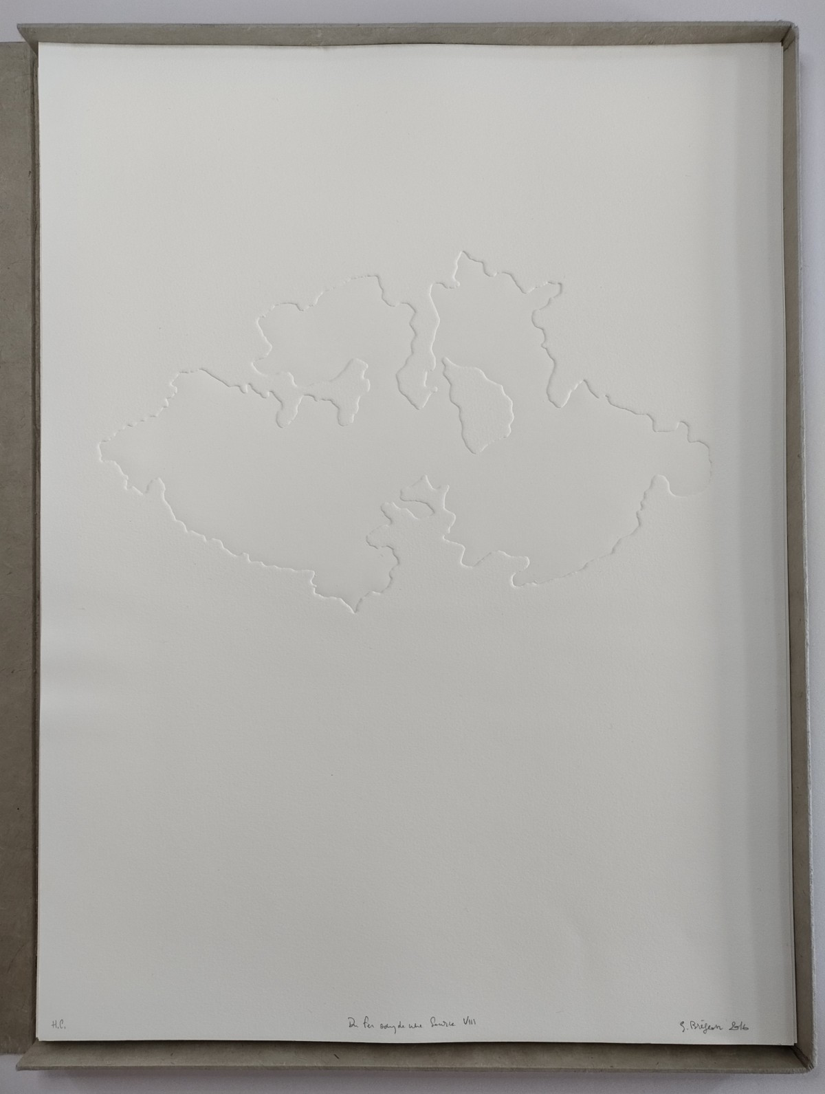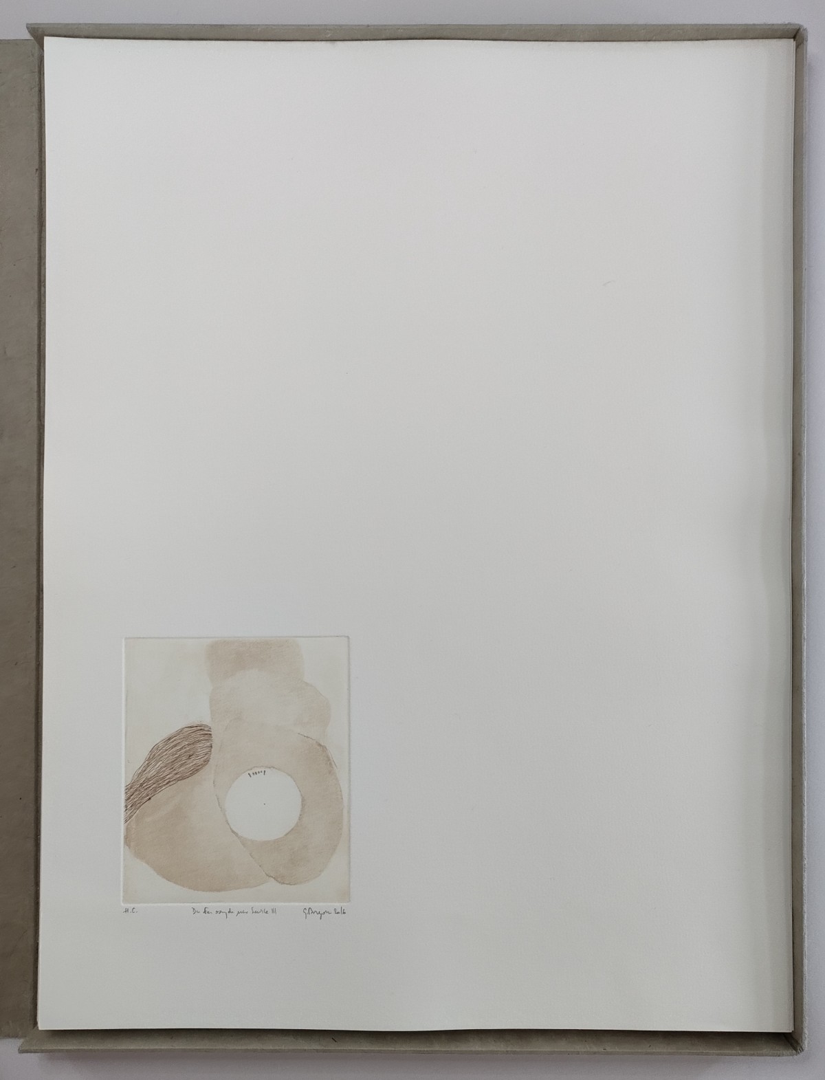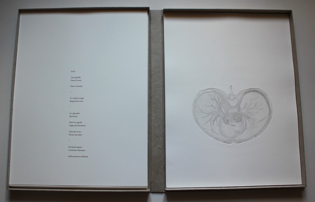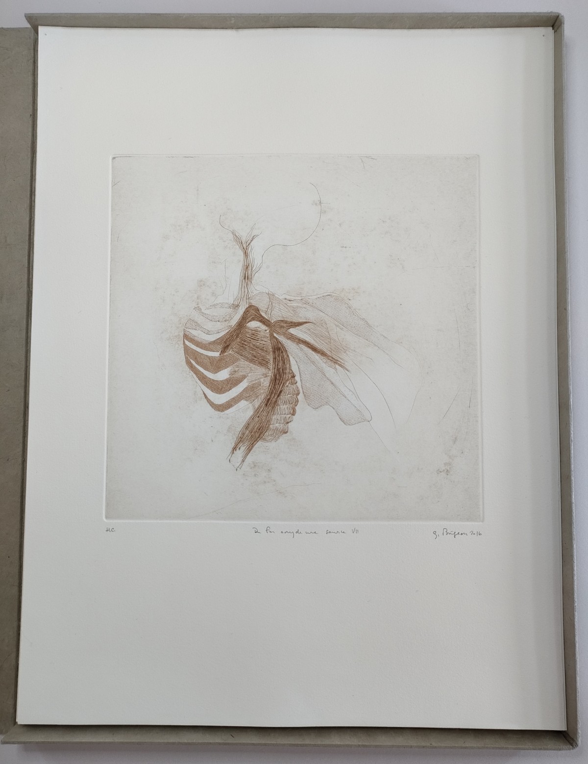 vingt textes imprimés à l’encre pigmentaire sur BFK Rives blanc 250g. accompagnés de vingt gravures imprimées sur papier BFK Rives blanc 250g, 43 planches, 38x50cm, emboitage habillé de Lokta gris réalisé par Carole Meigne, atelier de reliure In Quarto (01)