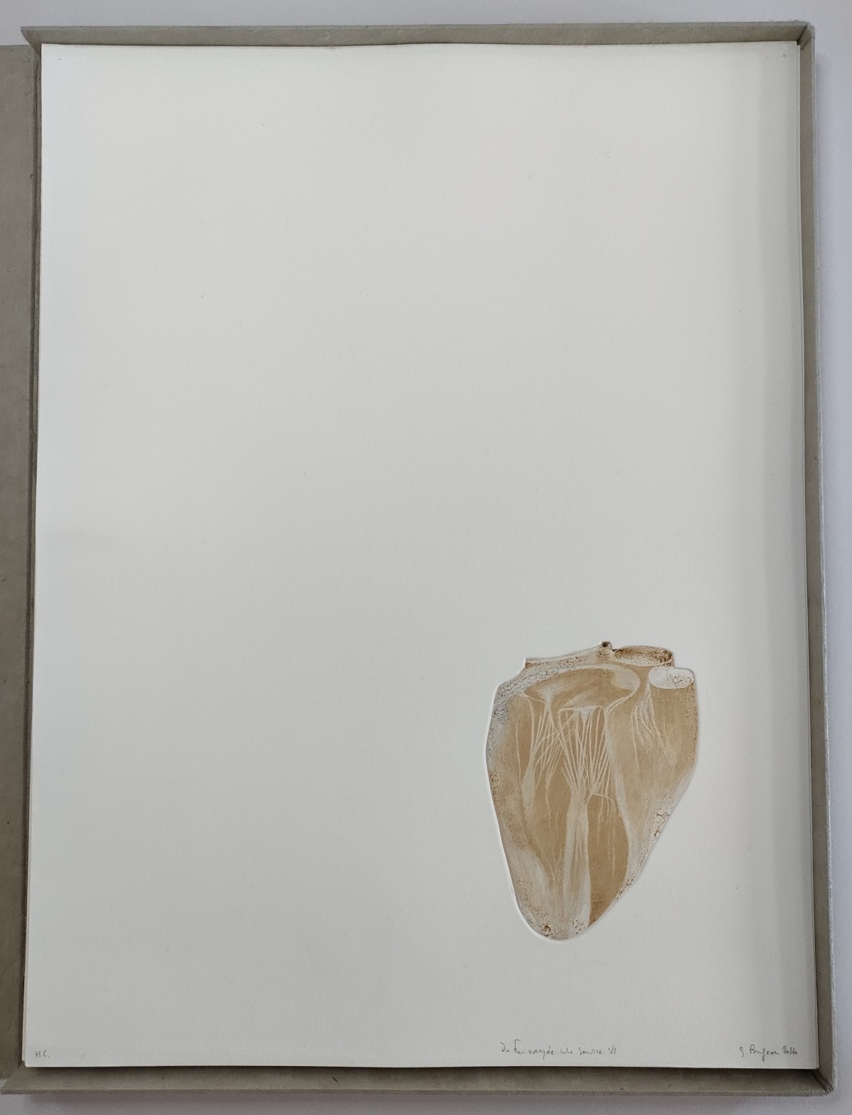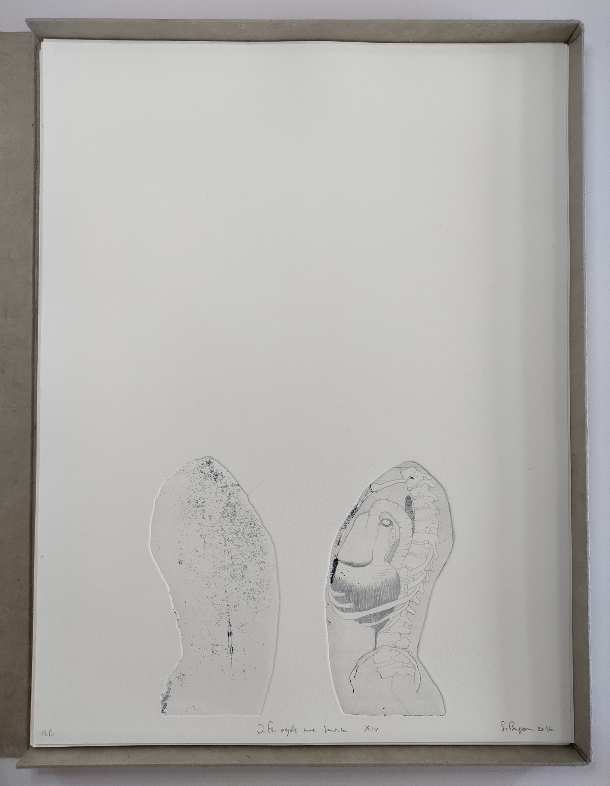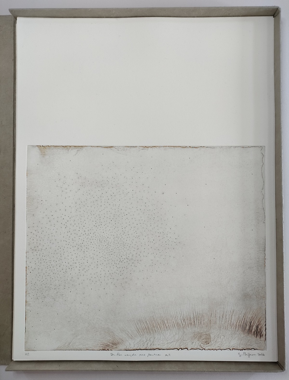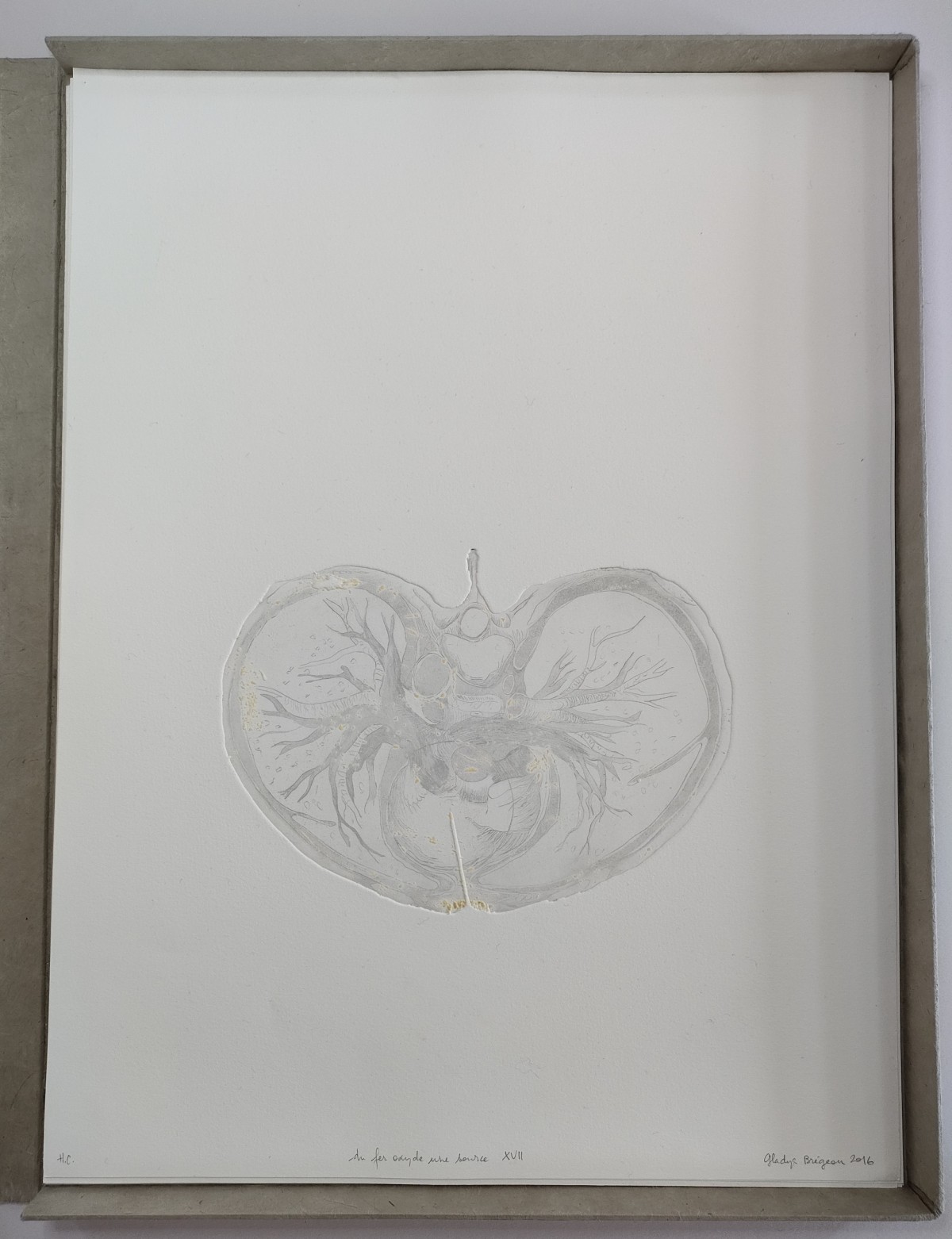 vingt textes imprimés à l’encre pigmentaire sur BFK Rives blanc 250g. accompagnés de vingt gravures imprimées sur papier BFK Rives blanc 250g, 43 planches, 38x50cm, emboitage habillé de Lokta gris réalisé par Carole Meigne, atelier de reliure In Quarto (01)