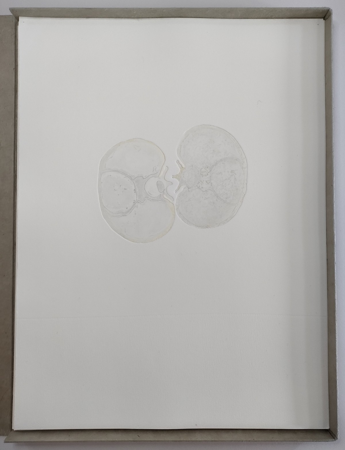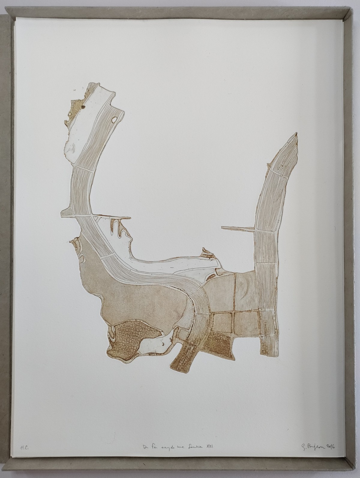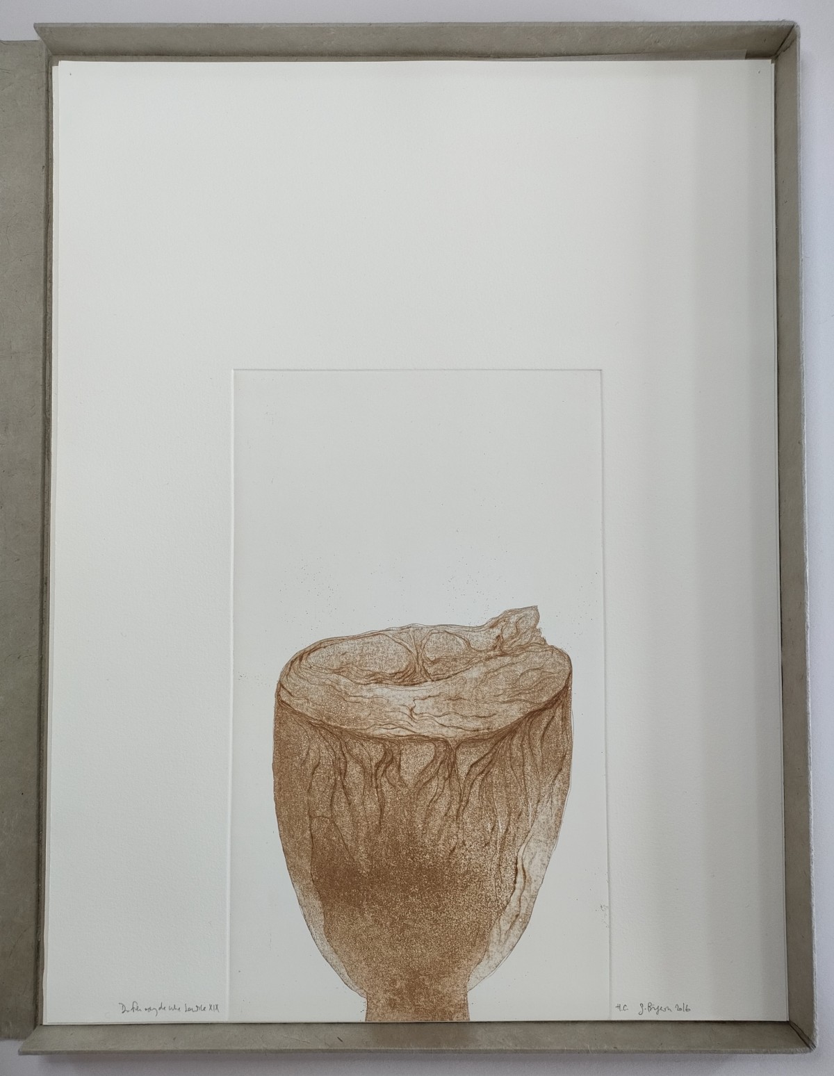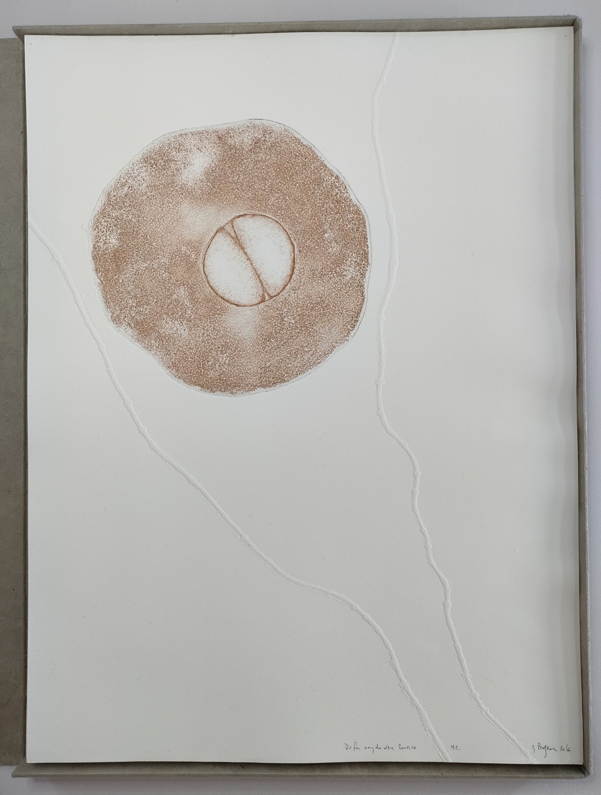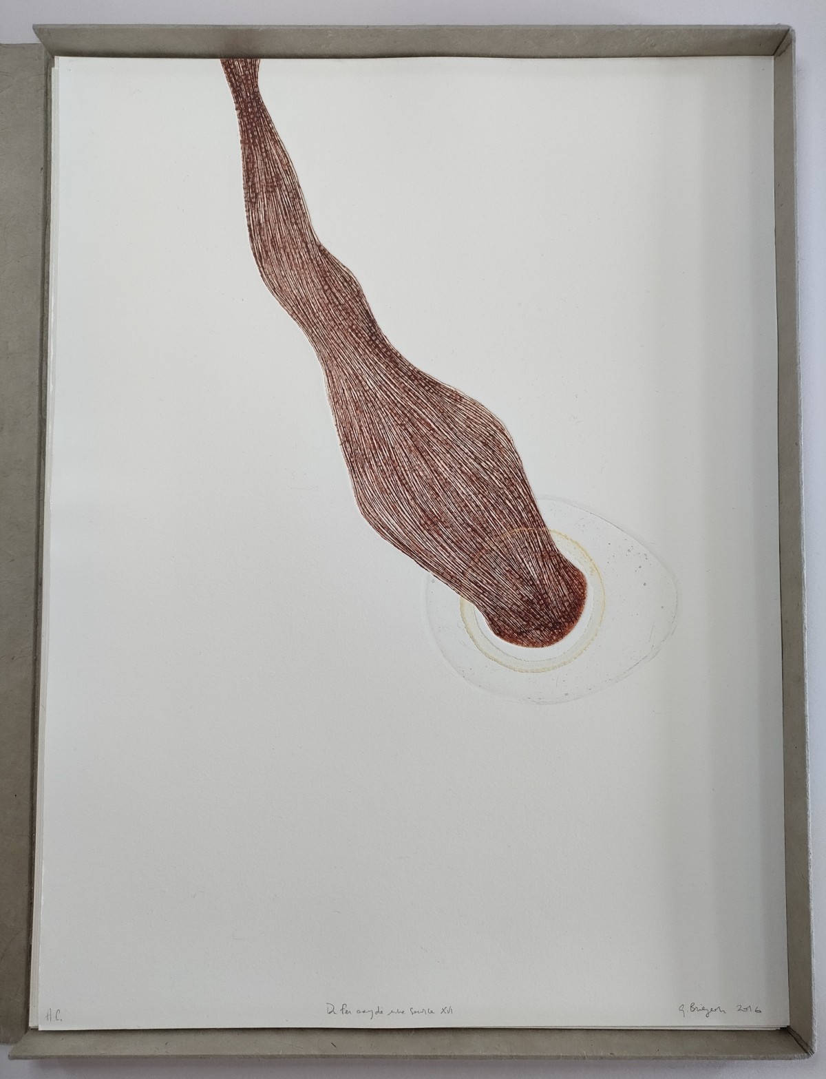 vingt textes imprimés à l’encre pigmentaire sur BFK Rives blanc 250g. accompagnés de vingt gravures imprimées sur papier BFK Rives blanc 250g, 43 planches, 38x50cm, emboitage habillé de Lokta gris réalisé par Carole Meigne, atelier de reliure In Quarto (01)