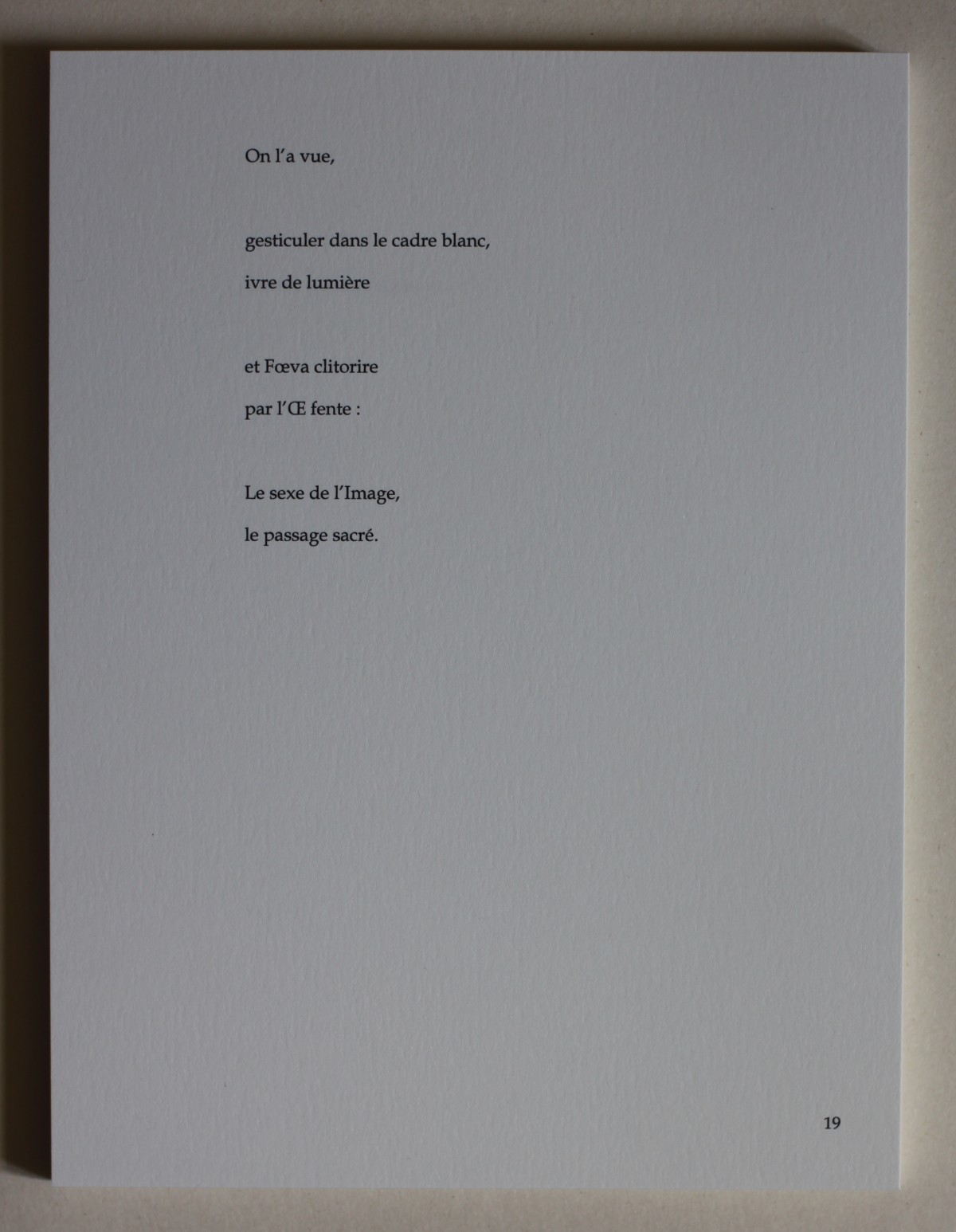 Le texte se décline en différentes variations de mise en page et de typographies allant du texte brut à la composition purement graphique. Entre matière et représentation, objet et sujet, le texte devient image, matière en mouvement, jusqu’à s’émanciper de l’espace physique du livre pour se projeter in situ sur des murs à l’échelle des corps ou encore se contraindre à celui du négatif argentique 24×36.