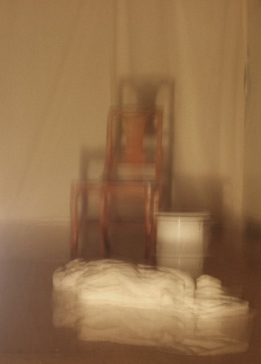 scénographie : chaise, drap blanc, pot de chambre, eau, tissus rouge.