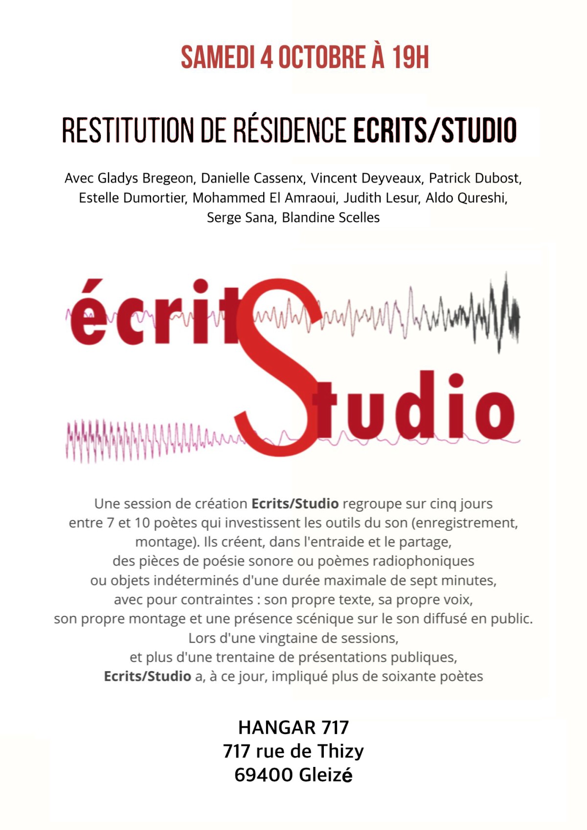Une session de création Ecrits/Studio regroupe sur cinq jours entre 7 et 10 poètes qui investissent les outils du son (enregistrement, montage). Ils créent, dans l'entraide et le partage, des pièces de poésie sonore, ou poèmes radiophoniques, ou objets indéterminés d'une durée maximale de sept minutes, avec pour contraintes : son propre texte, sa propre voix, son propre montage, et une présence scénique sur le son diffusé en public. Lors d'une vingtaine de sessions, et plus d'une trentaine de présentations publiques, Ecrits/Studio a, à ce jour, impliqué plus de soixante poètes.