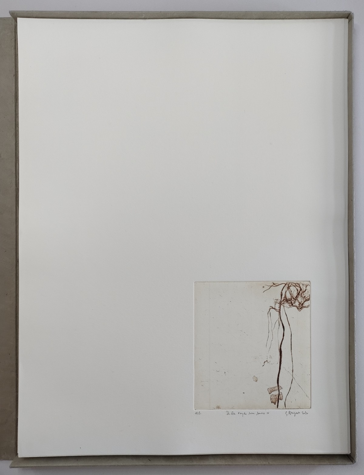 vingt textes imprimés à l’encre pigmentaire sur BFK Rives blanc 250g. accompagnés de vingt gravures imprimées sur papier BFK Rives blanc 250g, 43 planches, 38x50cm, emboitage habillé de Lokta gris réalisé par Carole Meigne, atelier de reliure In Quarto (01)