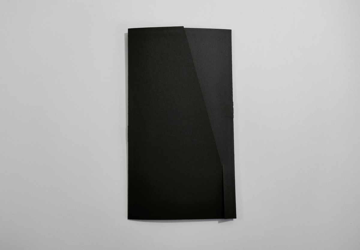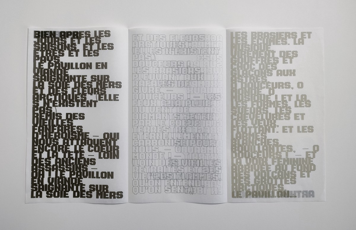 imprimé en police Barbara sur papier Wenzhou 30g. blanc 15x27cm, 2 plis, étui en pliage imbriqué Maya Clairefontaine 270g. noir 15,5x27,5cm