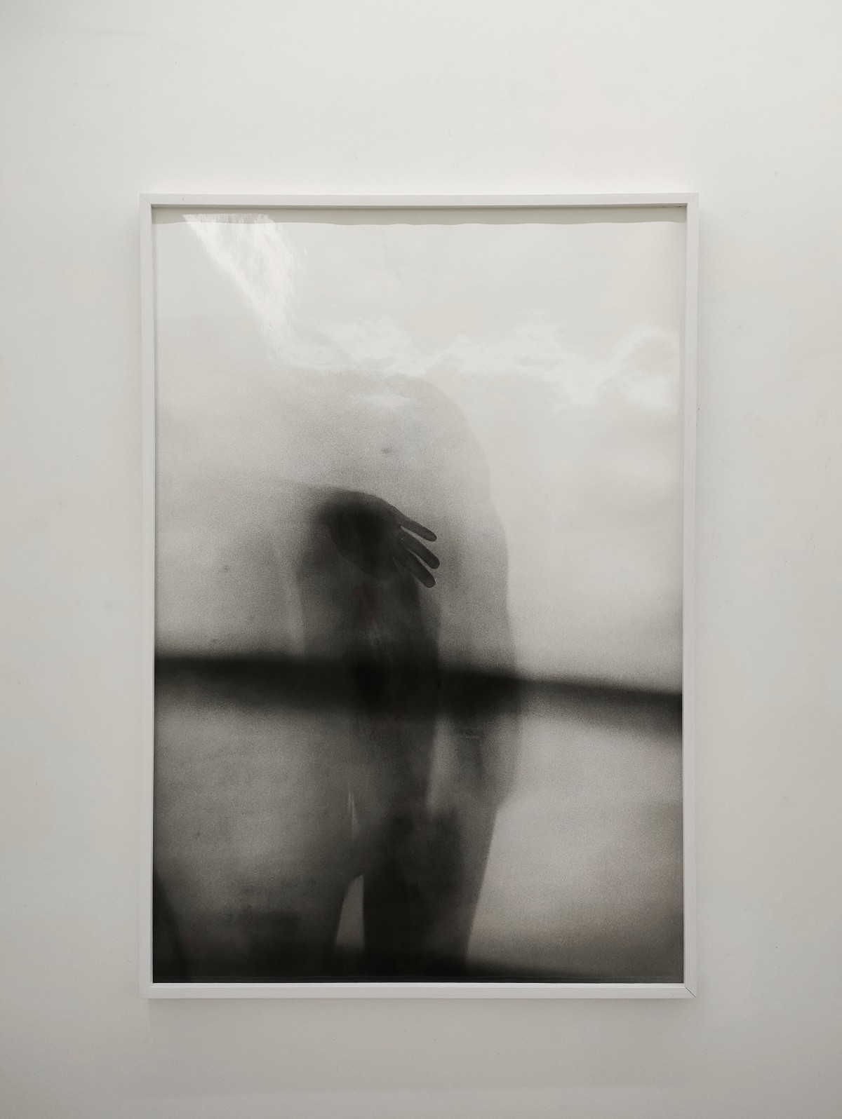 La main touche la paroi de l’image, depuis le côté du sujet.