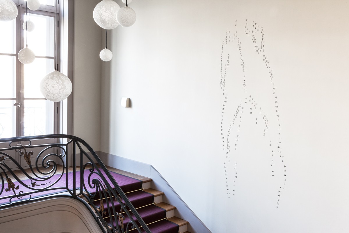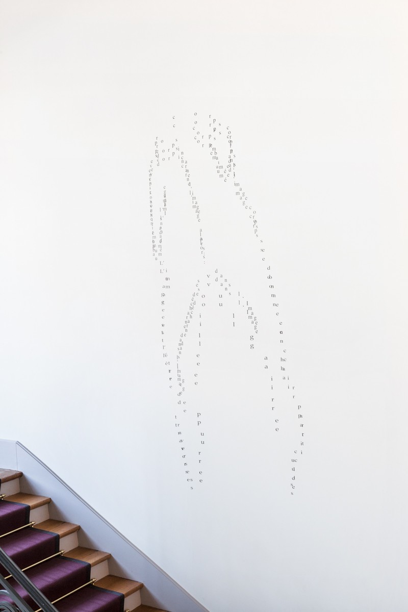 Lettrage apposé au mur sur le modèle de la planche 43 du livre d'artiste L’œ, en pleine plaie terre (2007).