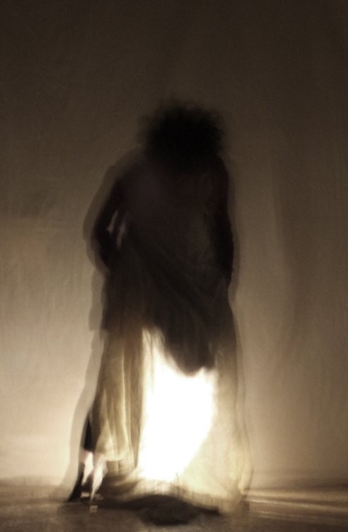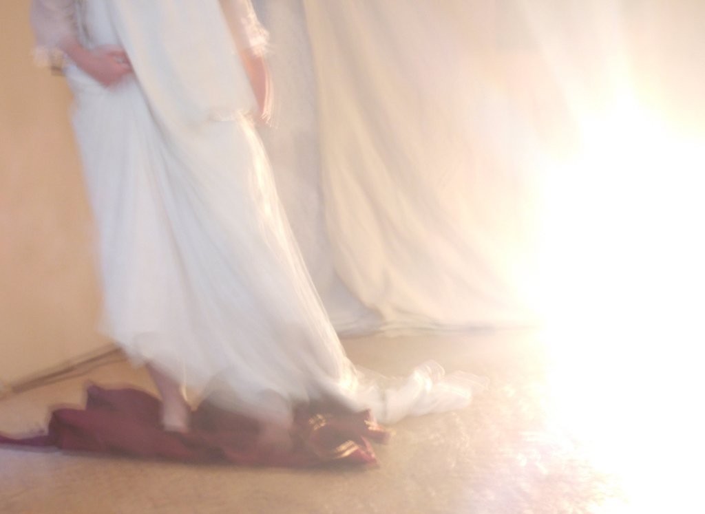 scénographie : chaise, drap blanc, pot de chambre, eau, tissus rouge.