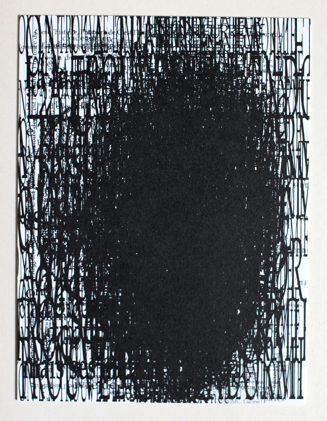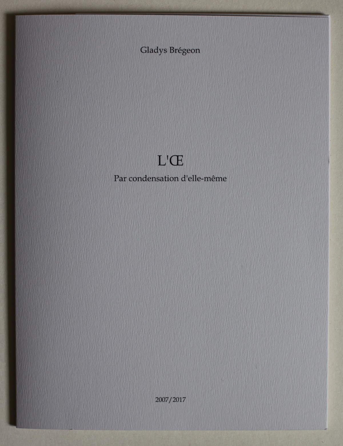 Ce tirage présente les 61 pages en calligrammes de L’Œ. En pleine plaie terre, compressées en un seul plan, tel un monogramme de L’Œ, nœud inextricable de code chiffré, abîme de données. Dans la confusion de son débordement, c'est aussi la crise identitaire du sujet, sans altérité autre qu'un tout indifférenciable, limon des possibles d'un nouvel espace de création.