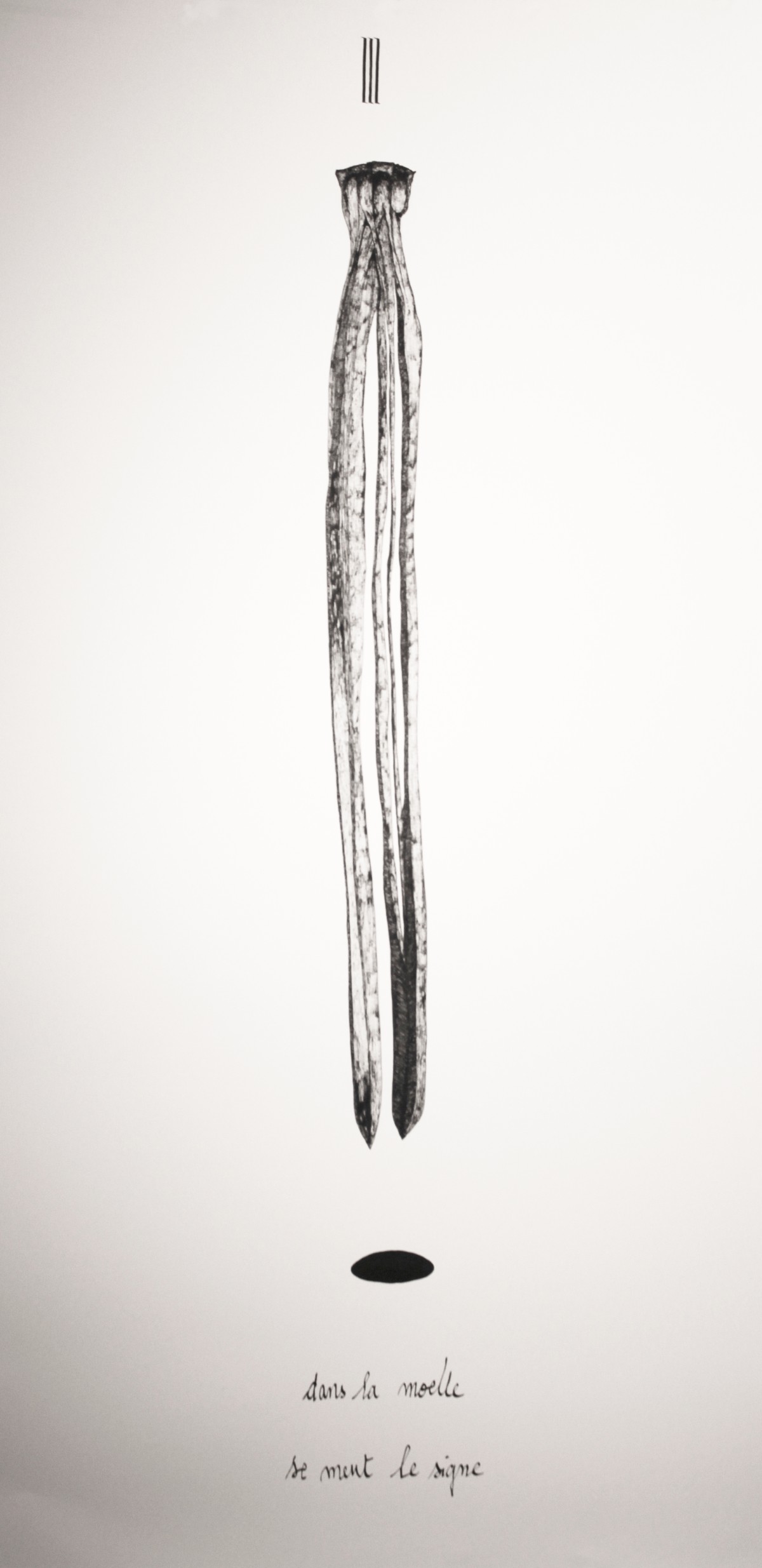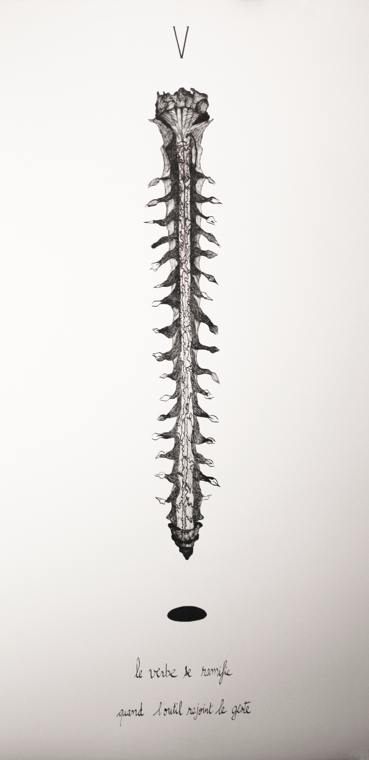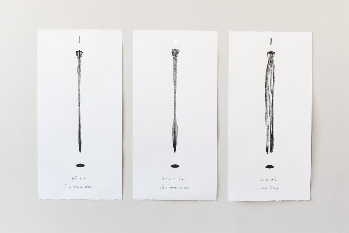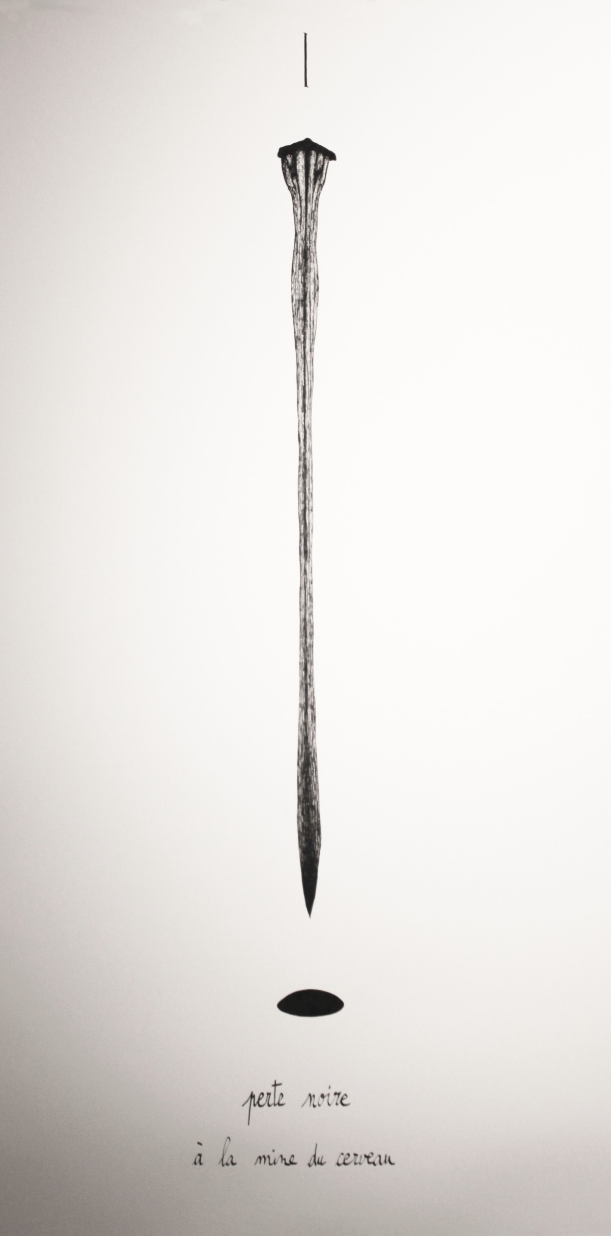 série de cinq dessins et textes à l’encre de chine et éosine sur papier BFK Rives blanc 300g. 60x120cm