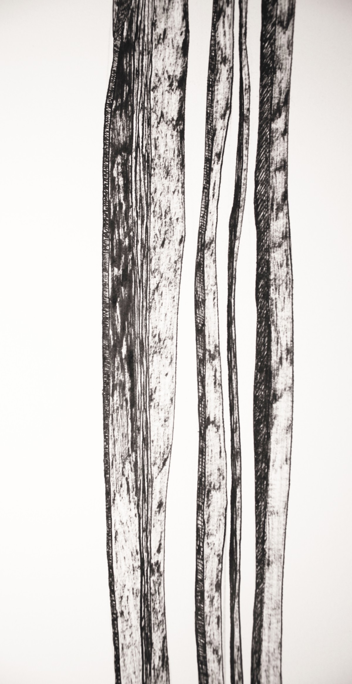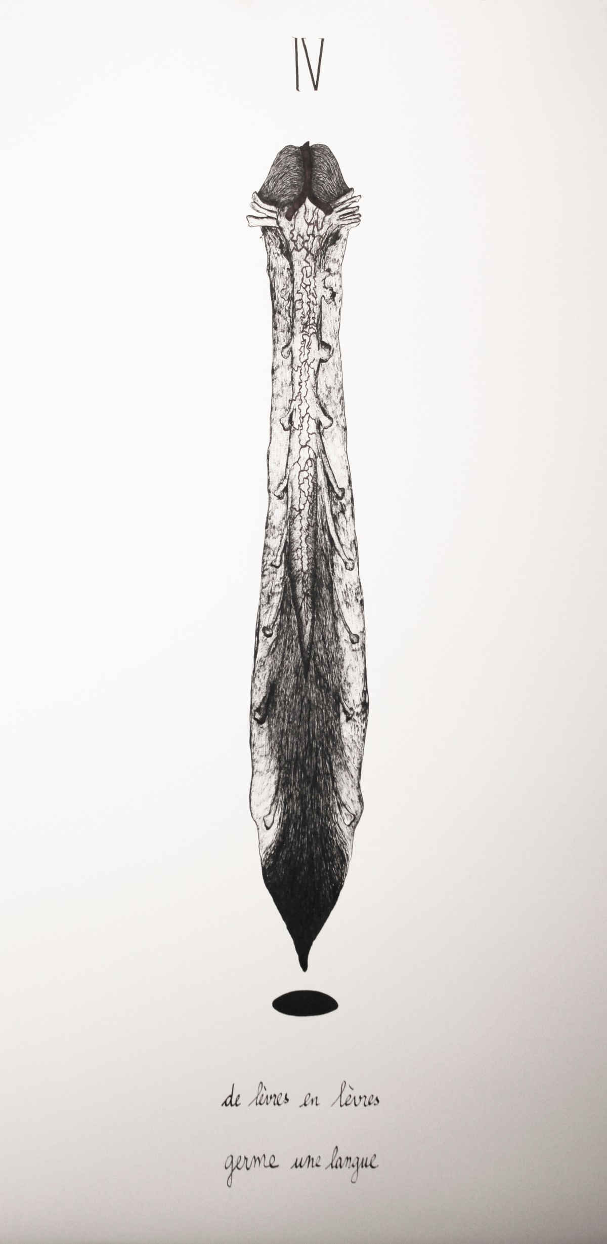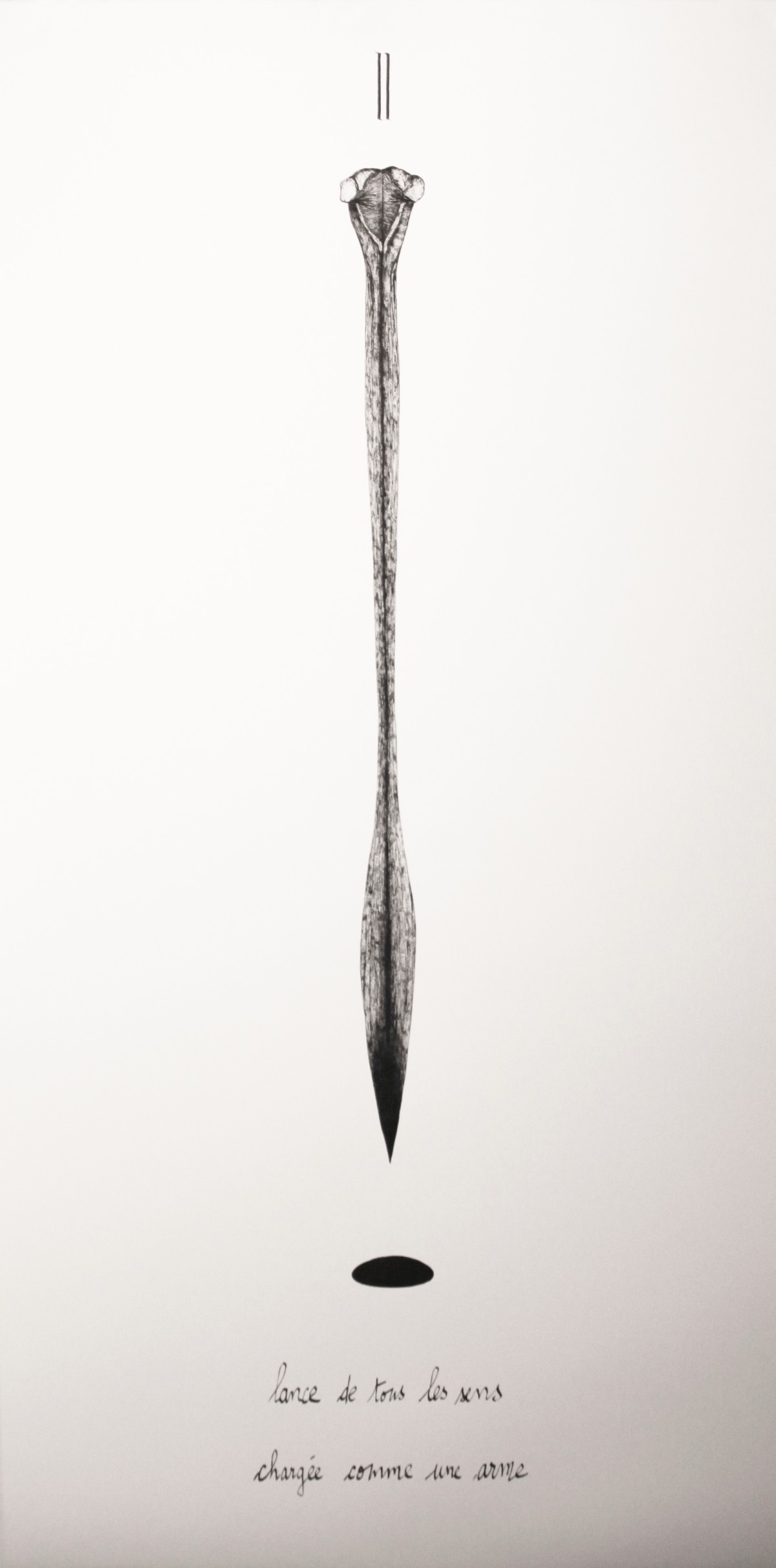 série de cinq dessins et textes à l’encre de chine et éosine sur papier BFK Rives blanc 300g. 60x120cm