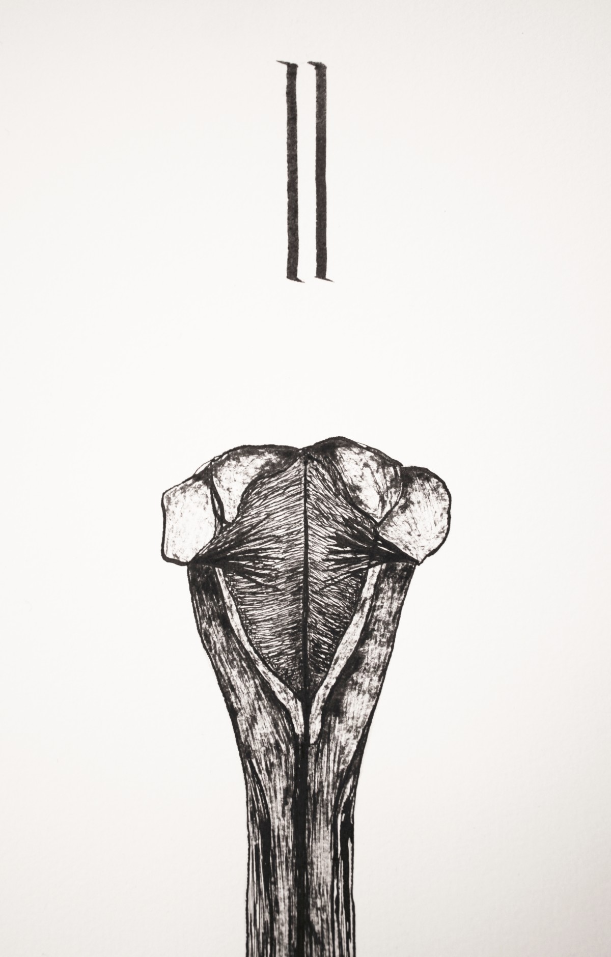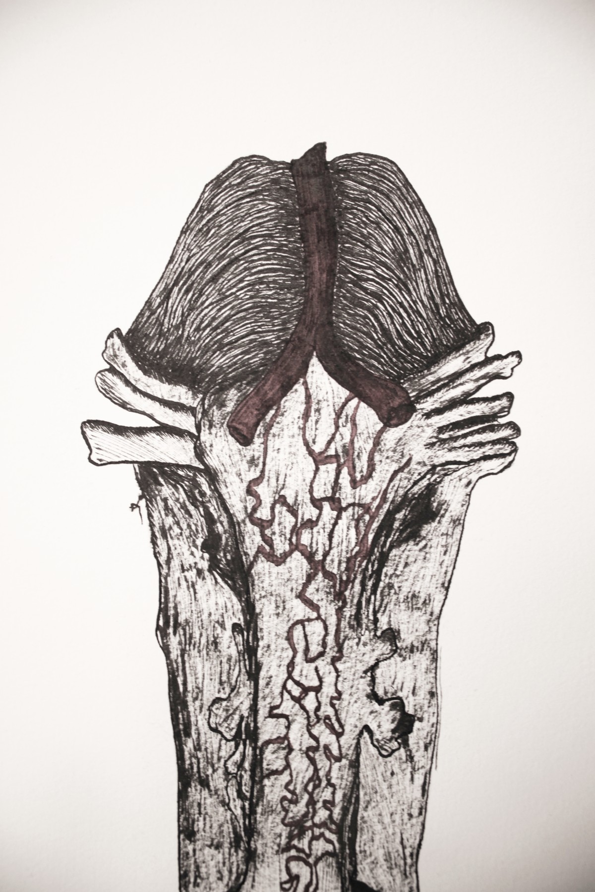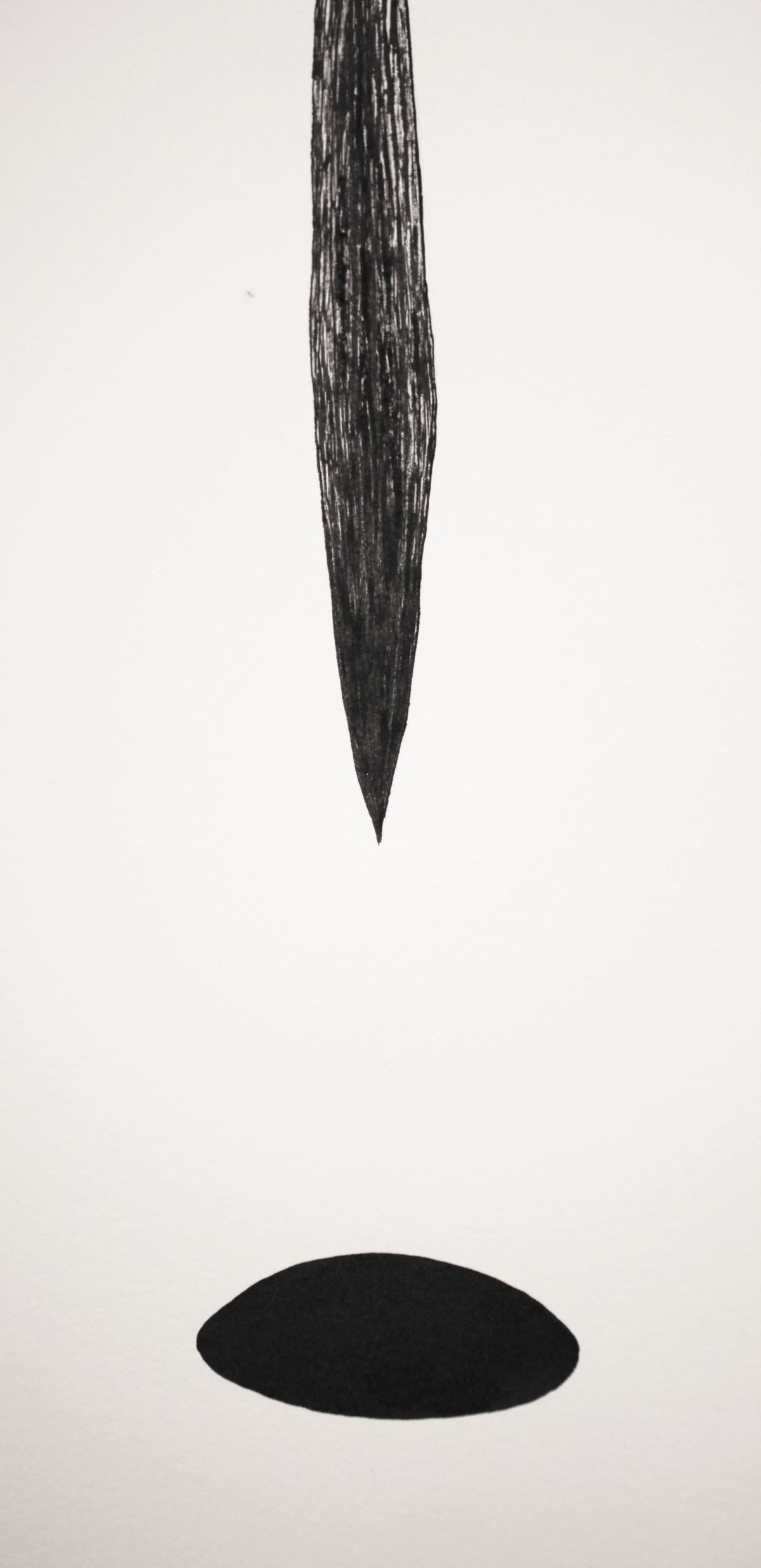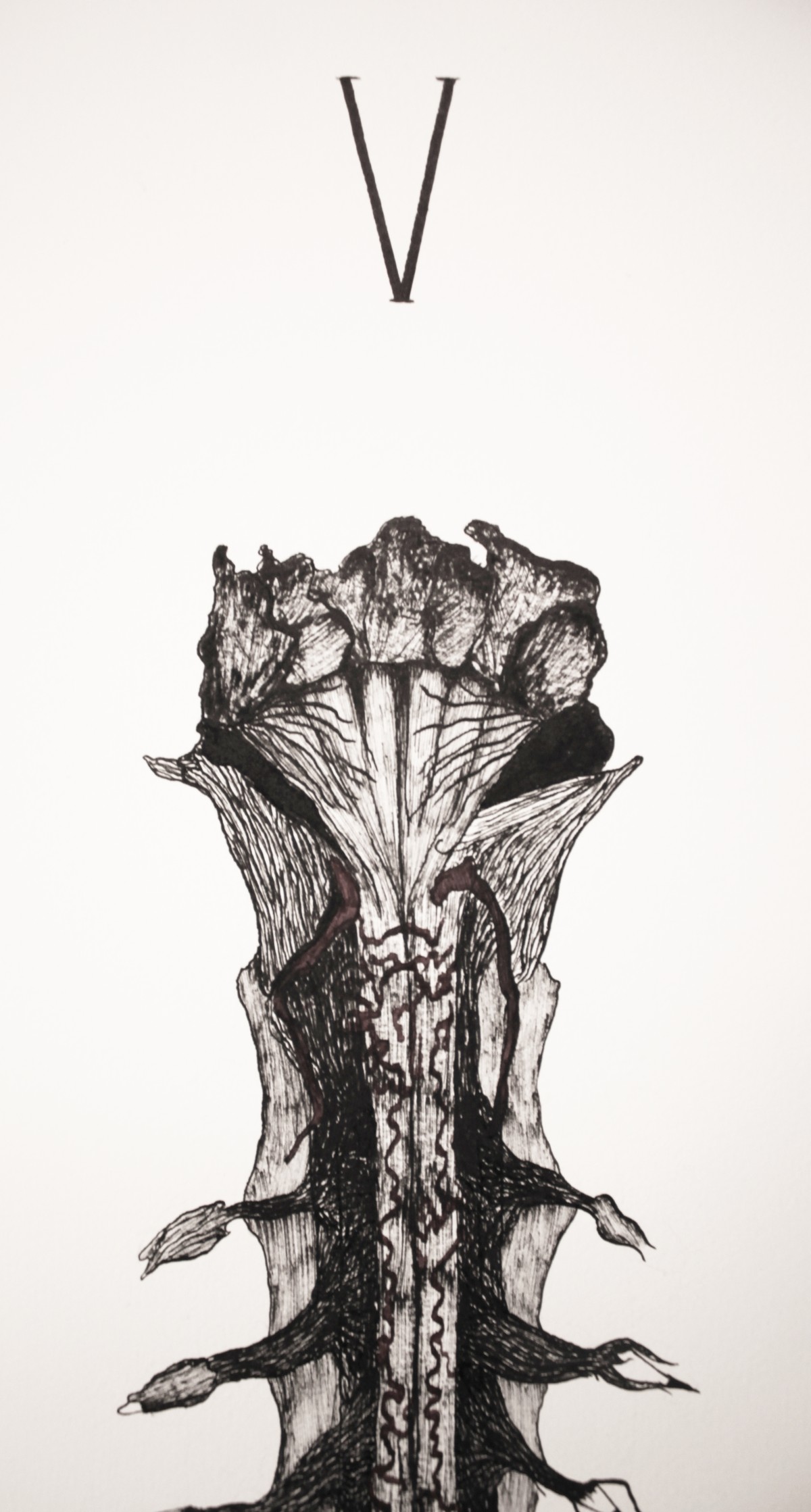 série de cinq dessins et textes à l’encre de chine et éosine sur papier BFK Rives blanc 300g. 60x120cm