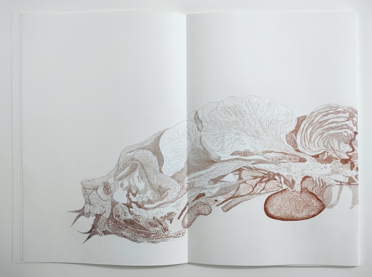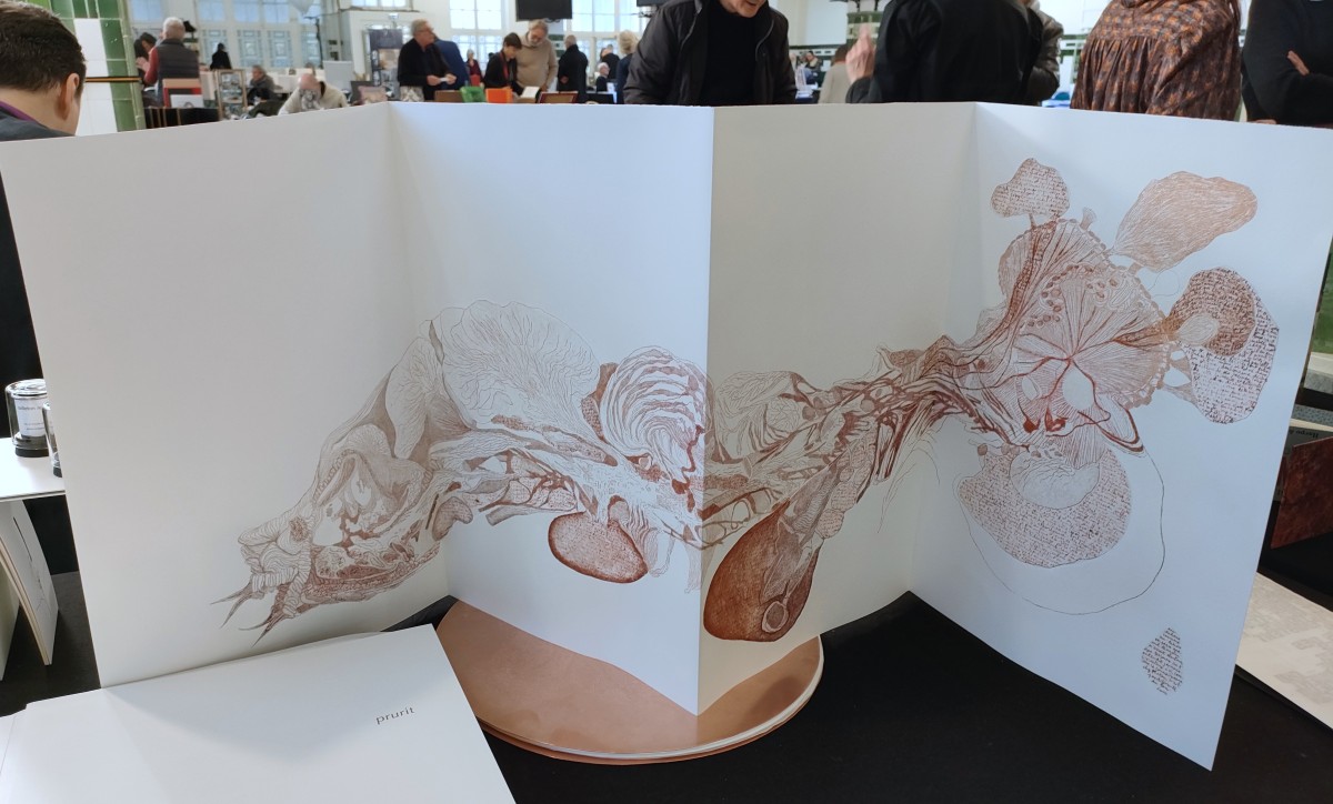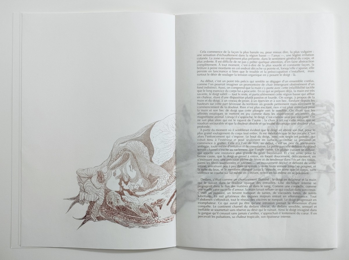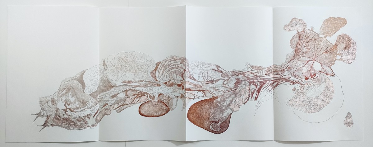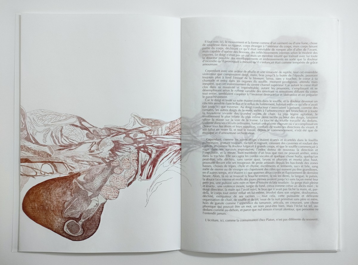 texte imprimé à l'encre pigmentaire sur papier Awagami Kozo blanc 42g. de 30x45cm accompagné d'une estampe de 120x45cm pliée en leporello, imprimée en taille douce sur papiers BFK Rives blanc 300g. et wenzhou blanc 30g., sous chemise avec dessins numériques imprimés à l’encre pigmentaire sur Rivoli Vélin blanc 240g,