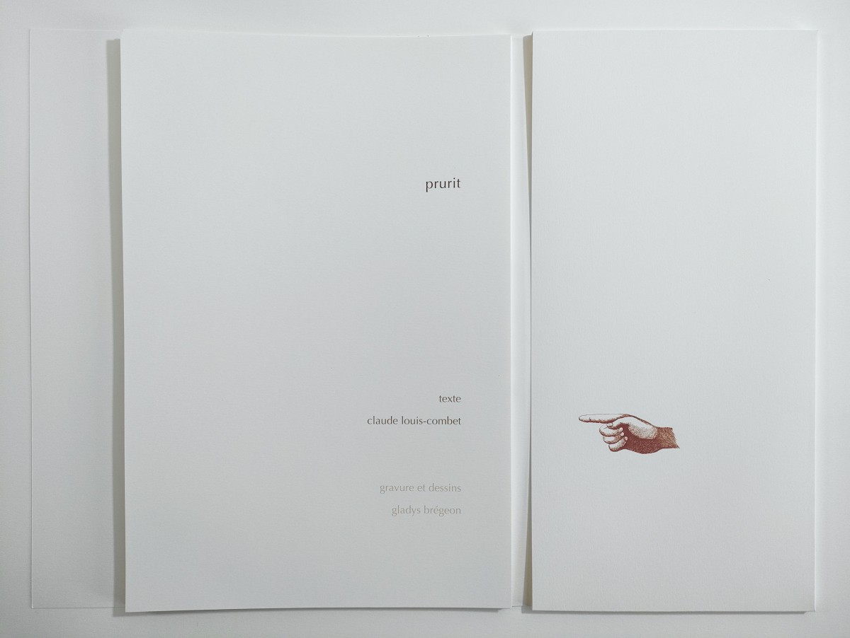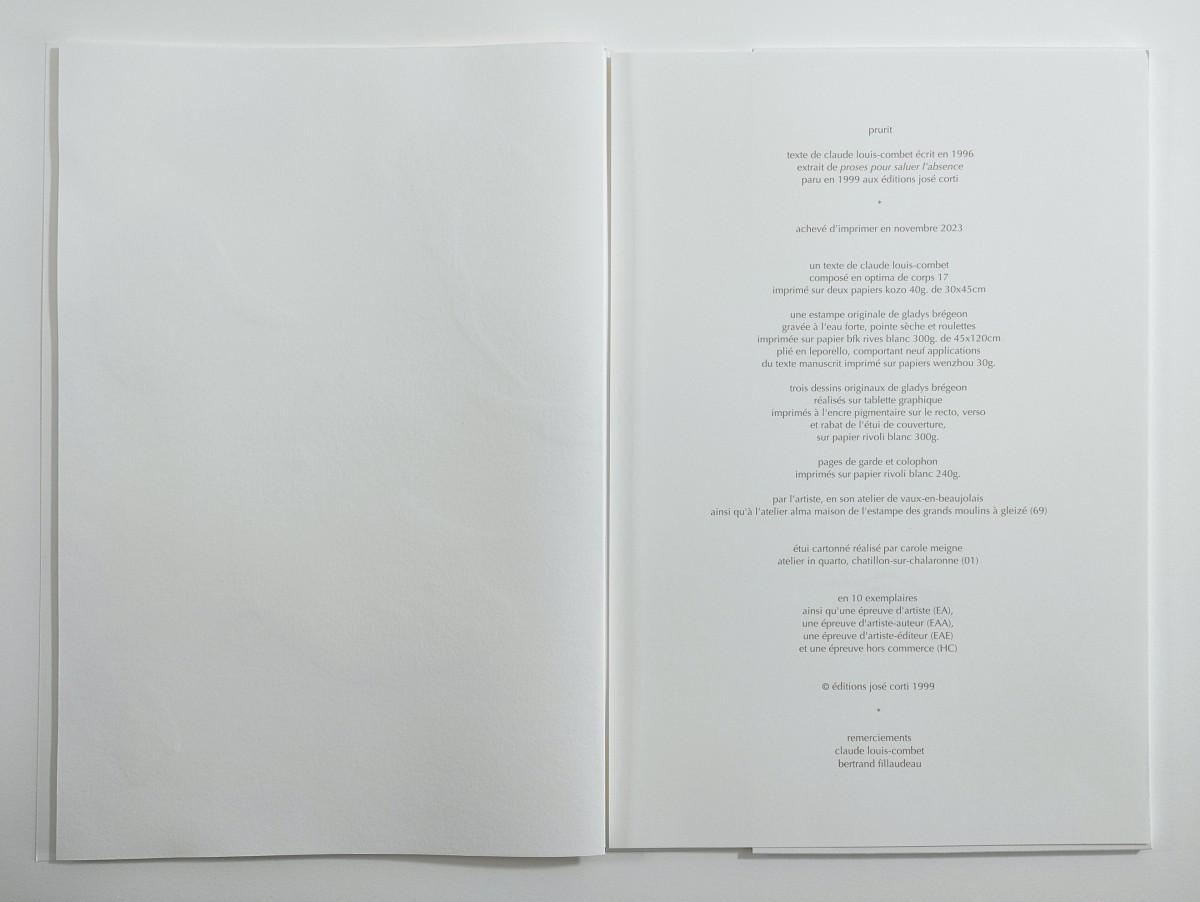 livre conçu et imprimé par Gladys Brégeon à partir d'un texte de Claude Louis-Combet paru en 1999 aux Éditions José Corti dans le recueil « Proses pour saluer l’absence »